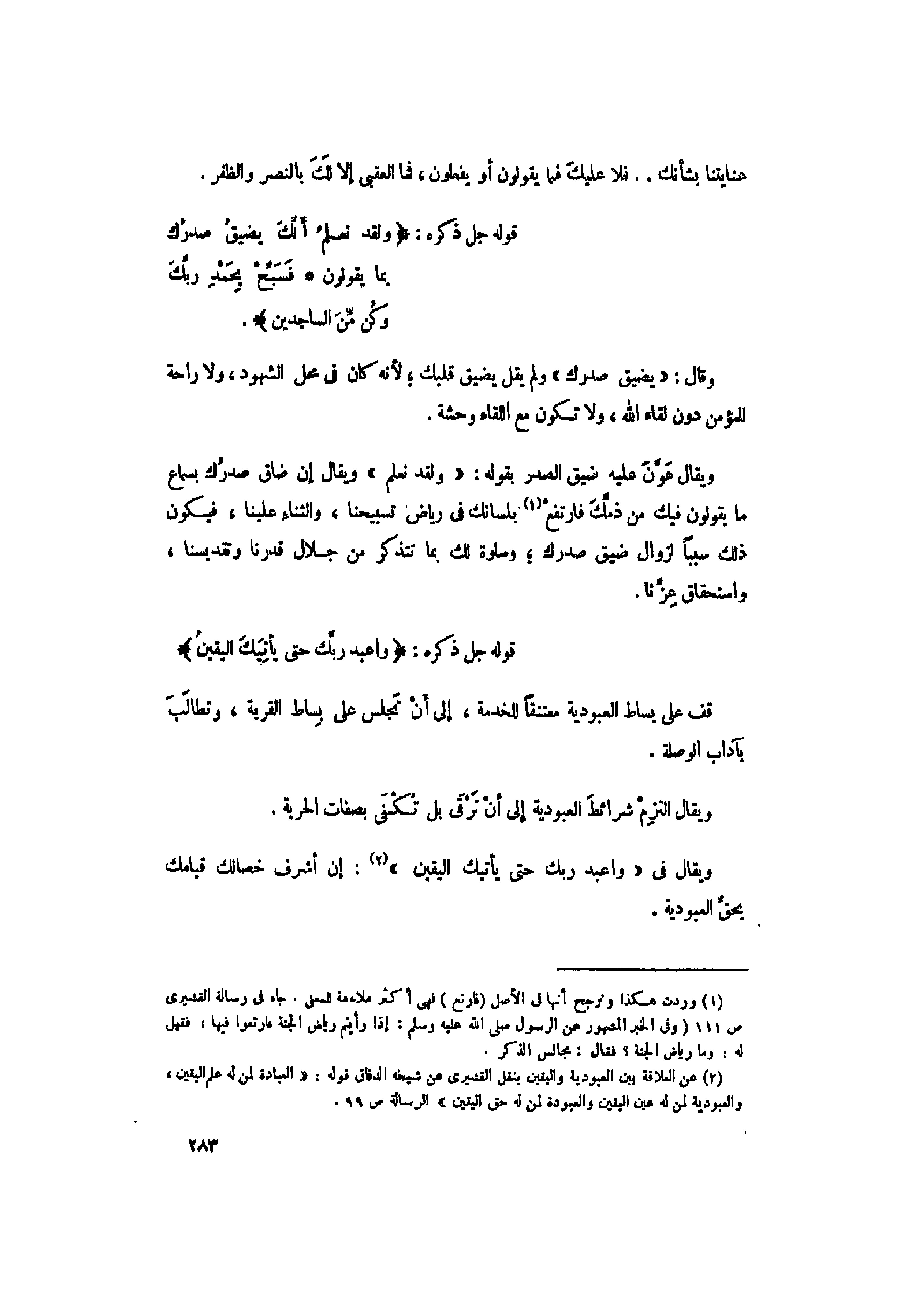 (2) عن العلاقة بين العبودية واليقين ينقل القشيري عن شيخه الدقاق قوله: «العبادة لمن له علم اليقين، والعبودية لمن له عين اليقين والعبودة لمن له حق اليقين» الرسالة ص 99.