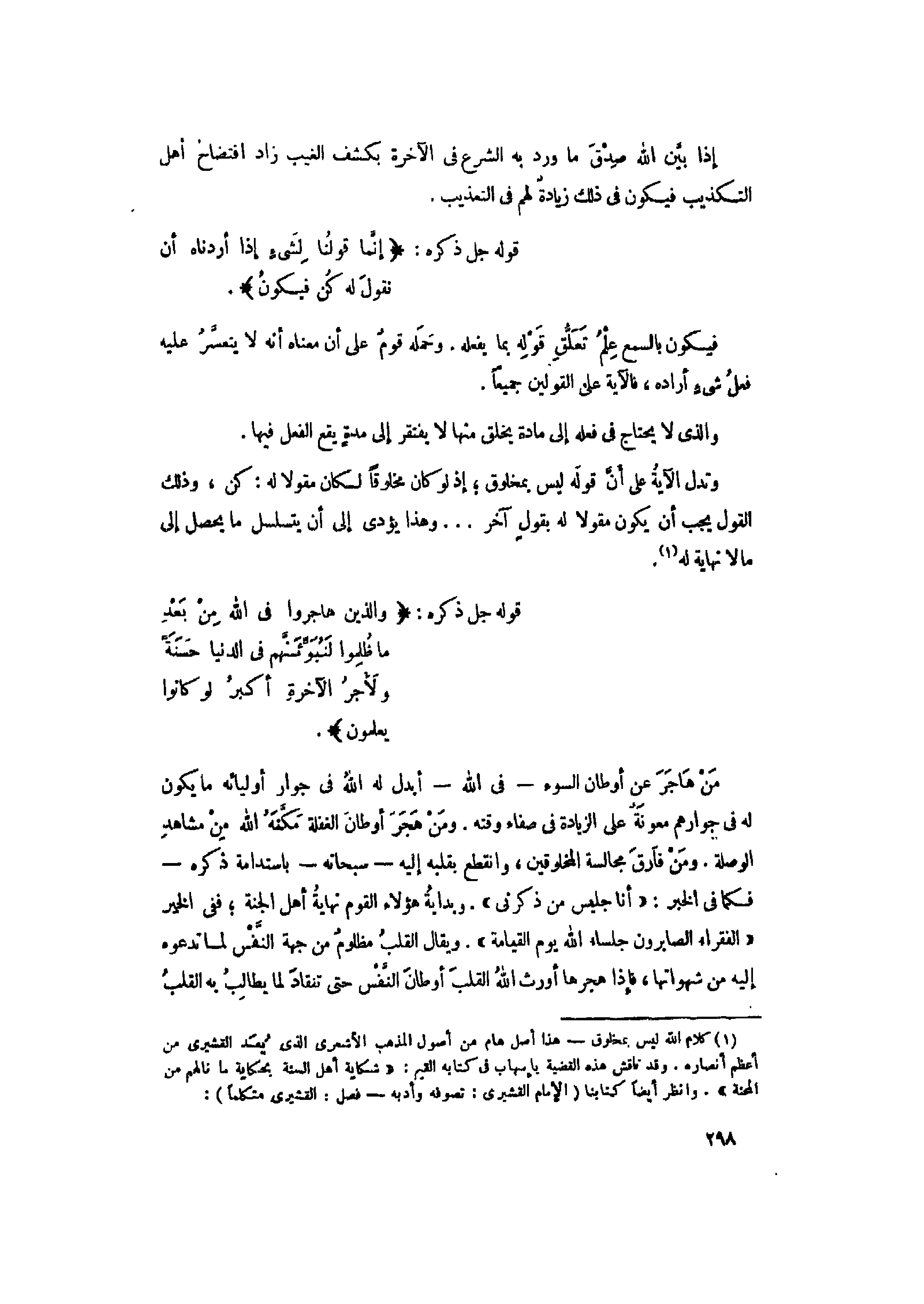 (1) كلام الله ليس بمخلوق- هذا أصل عام من أصول المذهب الأشعري الذي يعد القشيري من أعظم أنصاره. وقد ناقش هذه القضية بإسهاب فى كتابه القيم: «شكاية أهل السنة بحكاية ما نالهم من المحنة» . وانظر أيضا كتابنا (الإمام القشيري: تصوفه وأدبه- فصل: القشيري متكلما) :