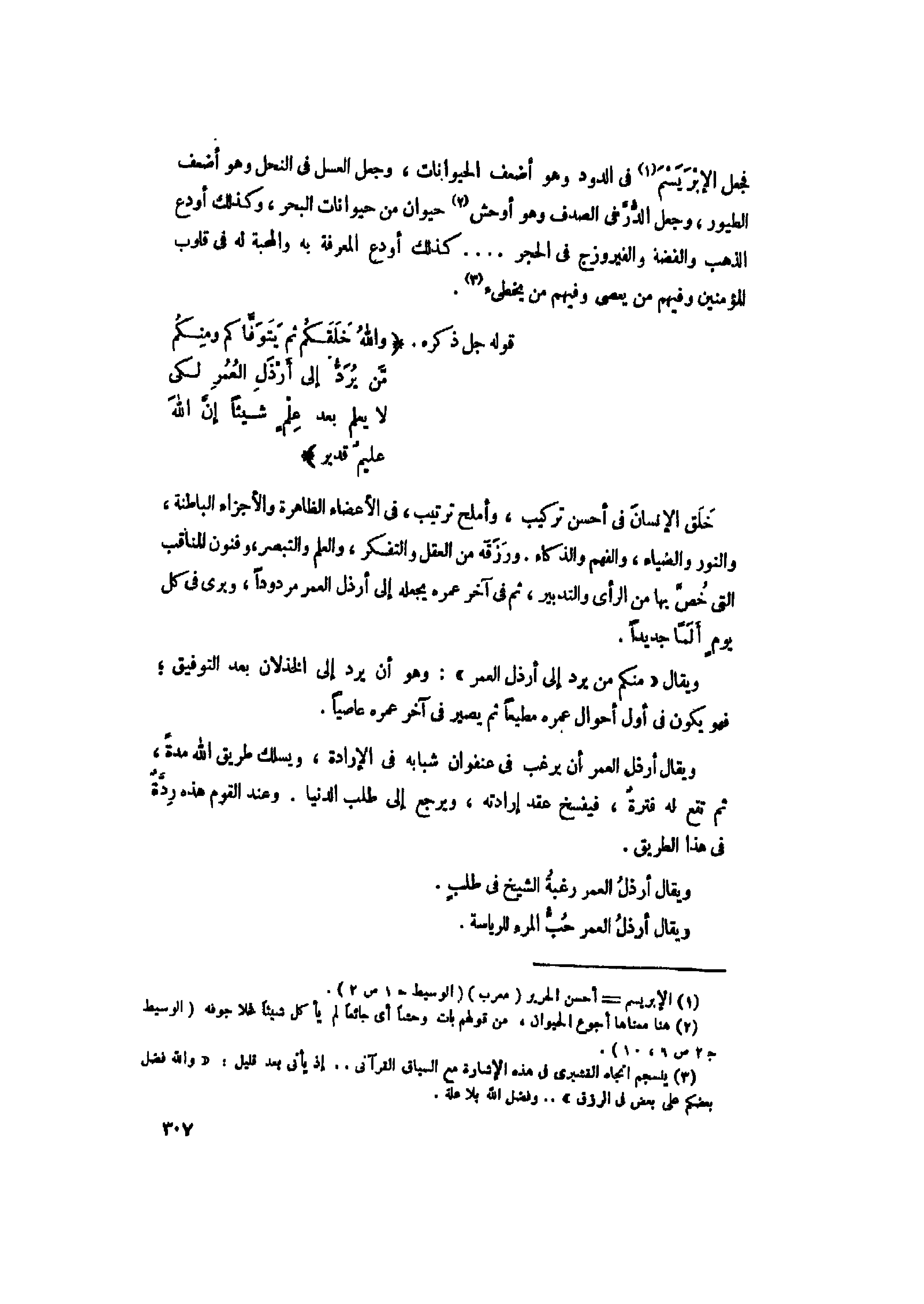 خلق الإنسان فى أحسن تركيب، وأملح ترتيب، فى الأعضاء الظاهرة والأجزاء الباطنة، والنور والضياء، والفهم والذكاء. ورزقه من العقل والتفكر، والعلم والتبصر، وفنون المناقب التي خصّ بها من الرأى والتدبير، ثم فى آخر عمره يجعله إلى أرذل العمر مردودا، ويرى فى كل يوم ألما جديدا.
