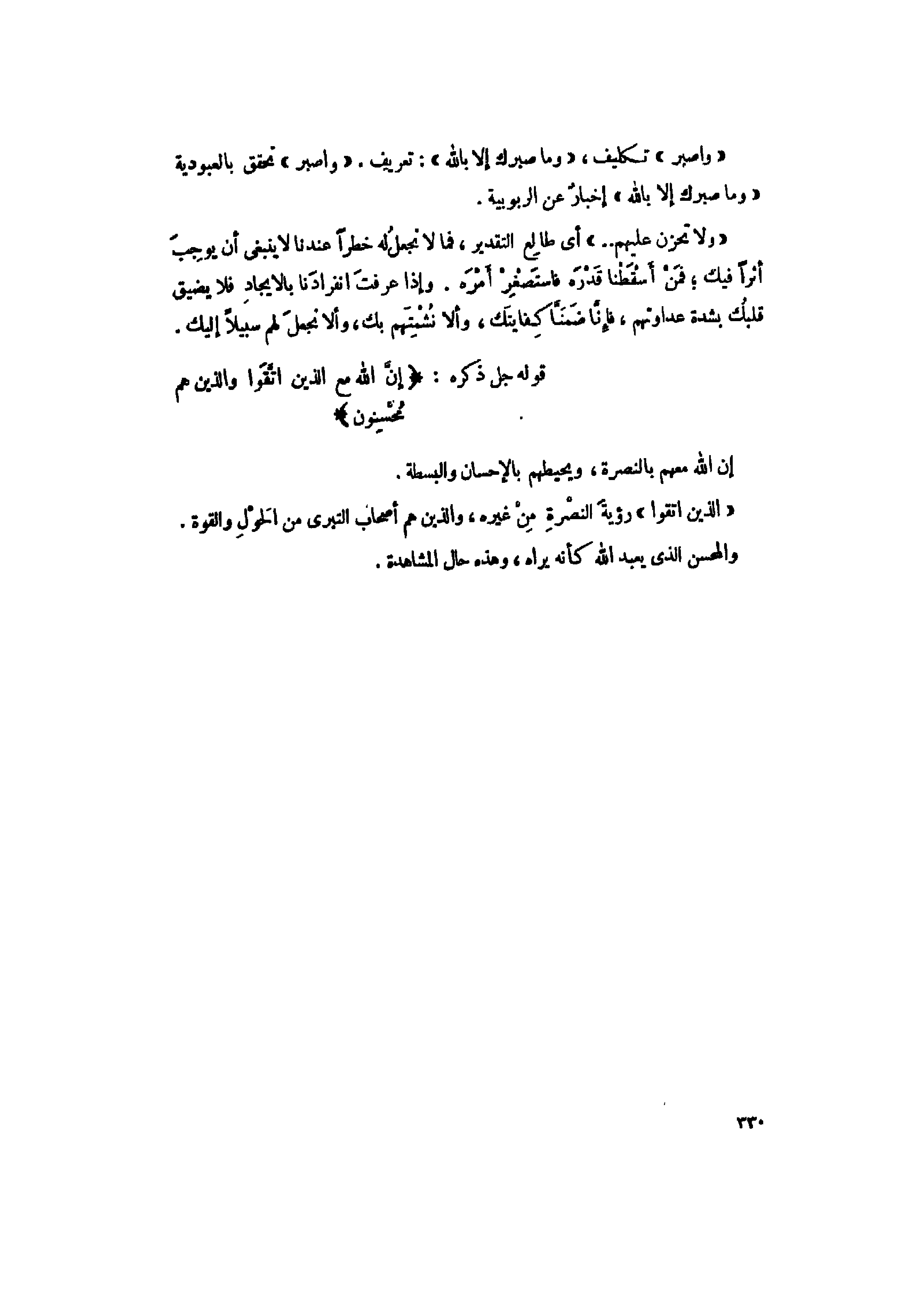 «وَاصْبِرْ» تكليف، «وَما صَبْرُكَ إِلَّا بِاللَّهِ» : تعريف. «وَاصْبِرْ» تحقق بالعبودية «وَما صَبْرُكَ إِلَّا بِاللَّهِ» إخبار عن الربوبية.