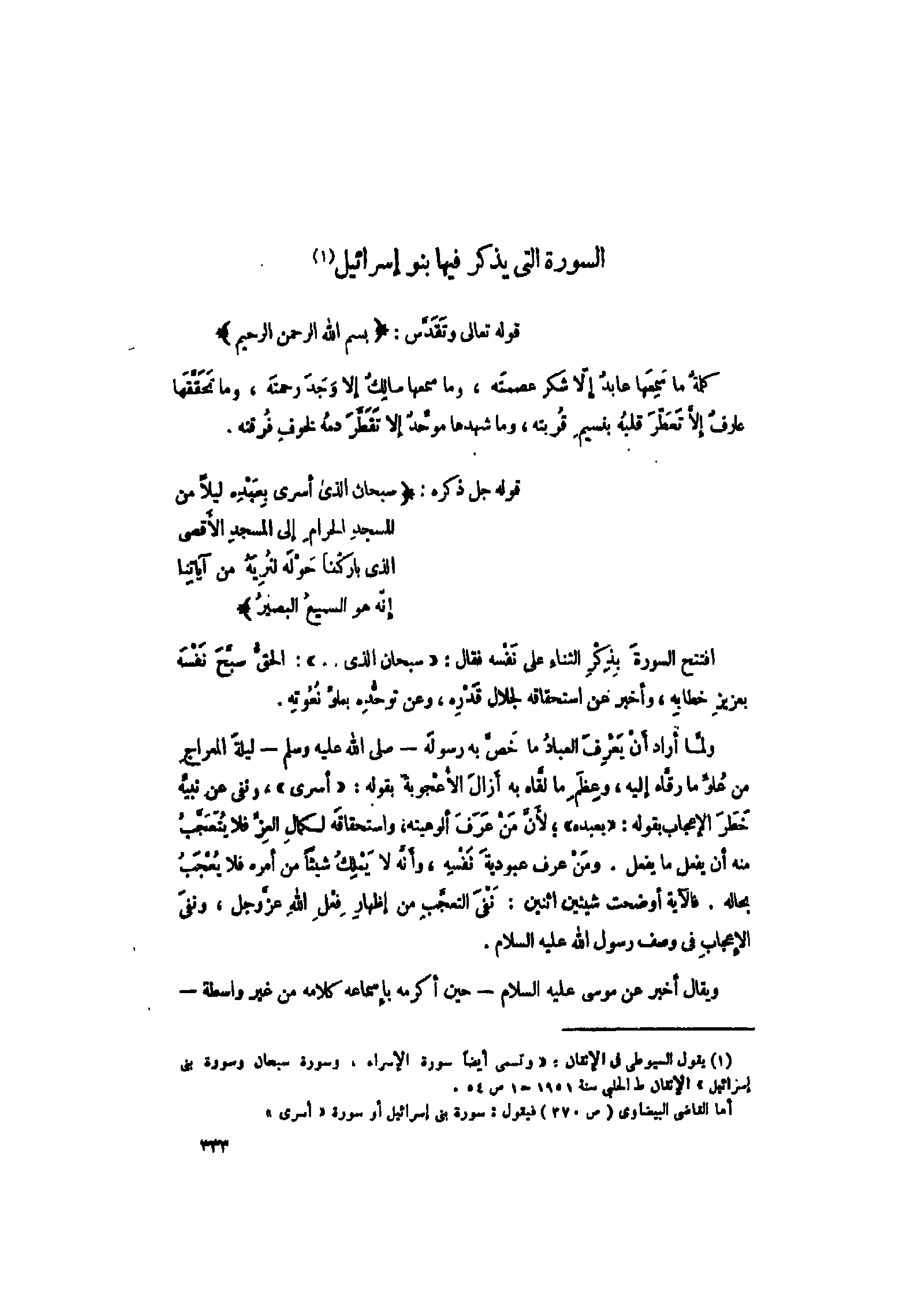 (1) يقول السيوطي فى الإتقان: «وتسمى أيضا سورة الإسراء، وسورة سبحان وسورة بنى إسرائيل» الإتقان ط الحلبي سنة 1951 ح 1 ص 54.