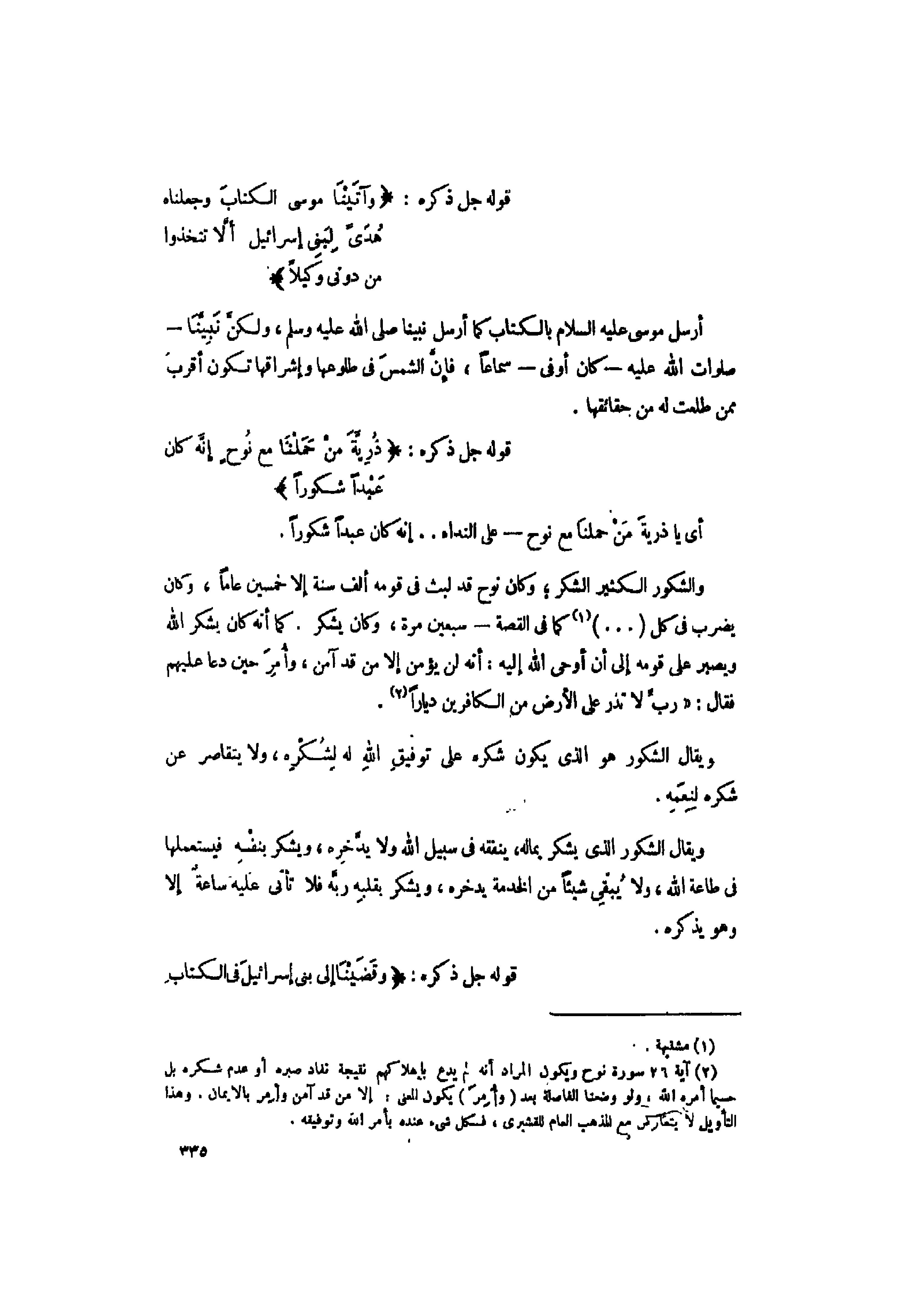 (2) آية 26 سورة نوح ويكون المراد أنه لم يدع بإهلاكهم نتيجة نفاد صبره أو عدم شكره بل حسبما أمره الله، ولو وضعنا الفاصلة بعد (وأمر) يكون المعنى: إلا من قد آمن وأمر بالايمان. وهذا التأويل لا يتعارض مع المذهب العام للقشيرى، فكل شىء عنده بأمر الله وتوفيقه.