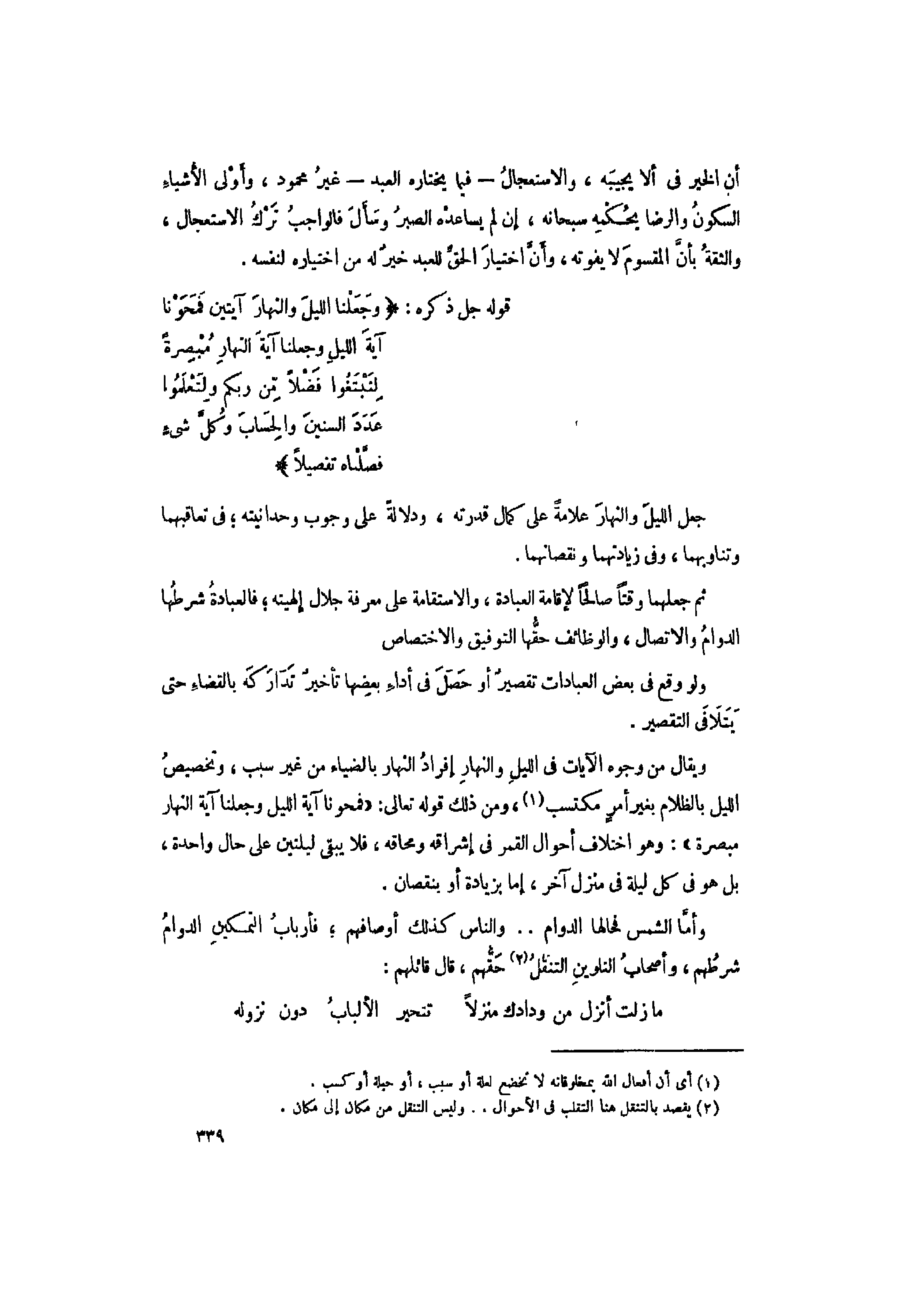 ويقال من وجوه الآيات فى الليل والنهار إفراد النهار بالضياء من غير سبب، وتخصيص الليل بالظلام بغير أمر مكتسب «1» ، ومن ذلك قوله تعالى: «فَمَحَوْنا آيَةَ اللَّيْلِ وَجَعَلْنا آيَةَ النَّهارِ مُبْصِرَةً» : وهو اختلاف أحوال القمر فى إشراقه ومحاقه، فلا يبقى ليلتين على حال واحدة، بل هو فى كل ليلة فى منزل آخر، إما بزيادة أو بنقصان.