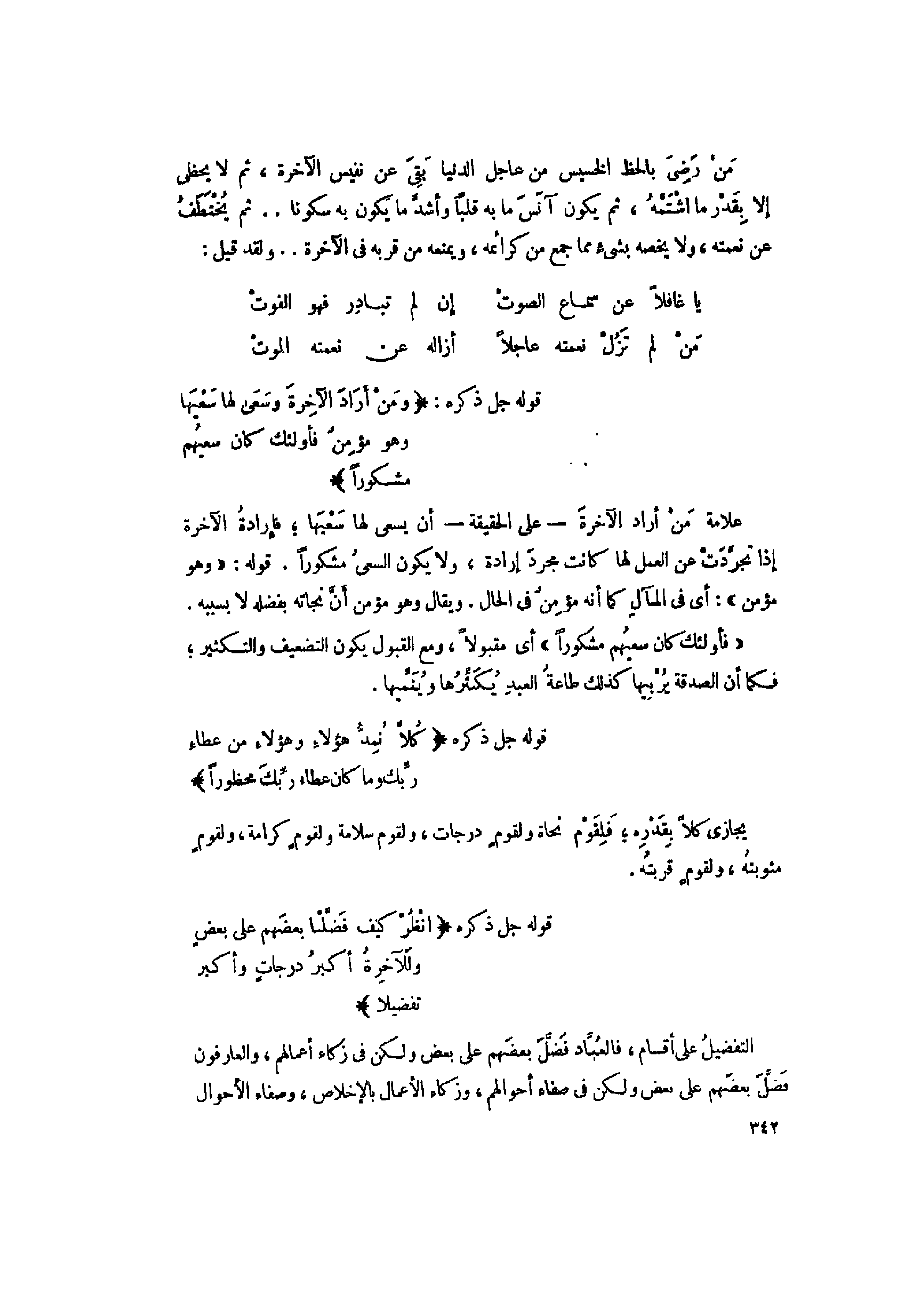 علامة من أراد الآخرة- على الحقيقة- أن يسعى لها سعيها فإرادة الآخرة إذا تجرّدت عن العمل لها كانت مجرد إرادة، ولا يكون السعى مشكورا. قوله: «وَهُوَ مُؤْمِنٌ» : أي فى المآل كما أنه مؤمن فى الحال. ويقال وهو مؤمن أنّ نجاته بفضله لا بسببه.