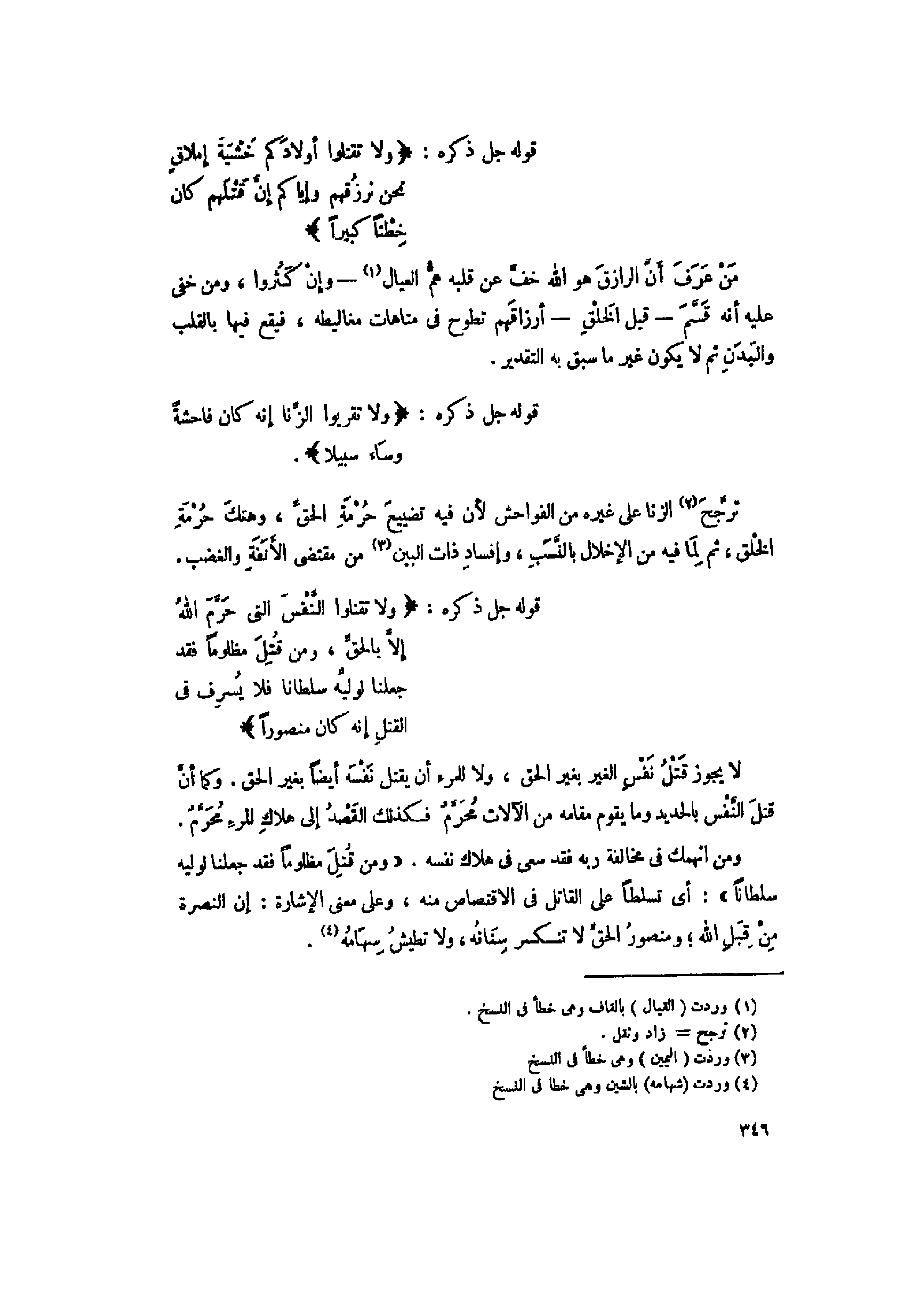 وَلا تَقْتُلُوا النَّفْسَ الَّتِي حَرَّمَ اللَّهُ إِلاَّ بِالْحَقِّ وَمَنْ قُتِلَ مَظْلُوماً فَقَدْ جَعَلْنا لِوَلِيِّهِ سُلْطاناً فَلا يُسْرِفْ فِي الْقَتْلِ إِنَّهُ كانَ مَنْصُوراً (33)