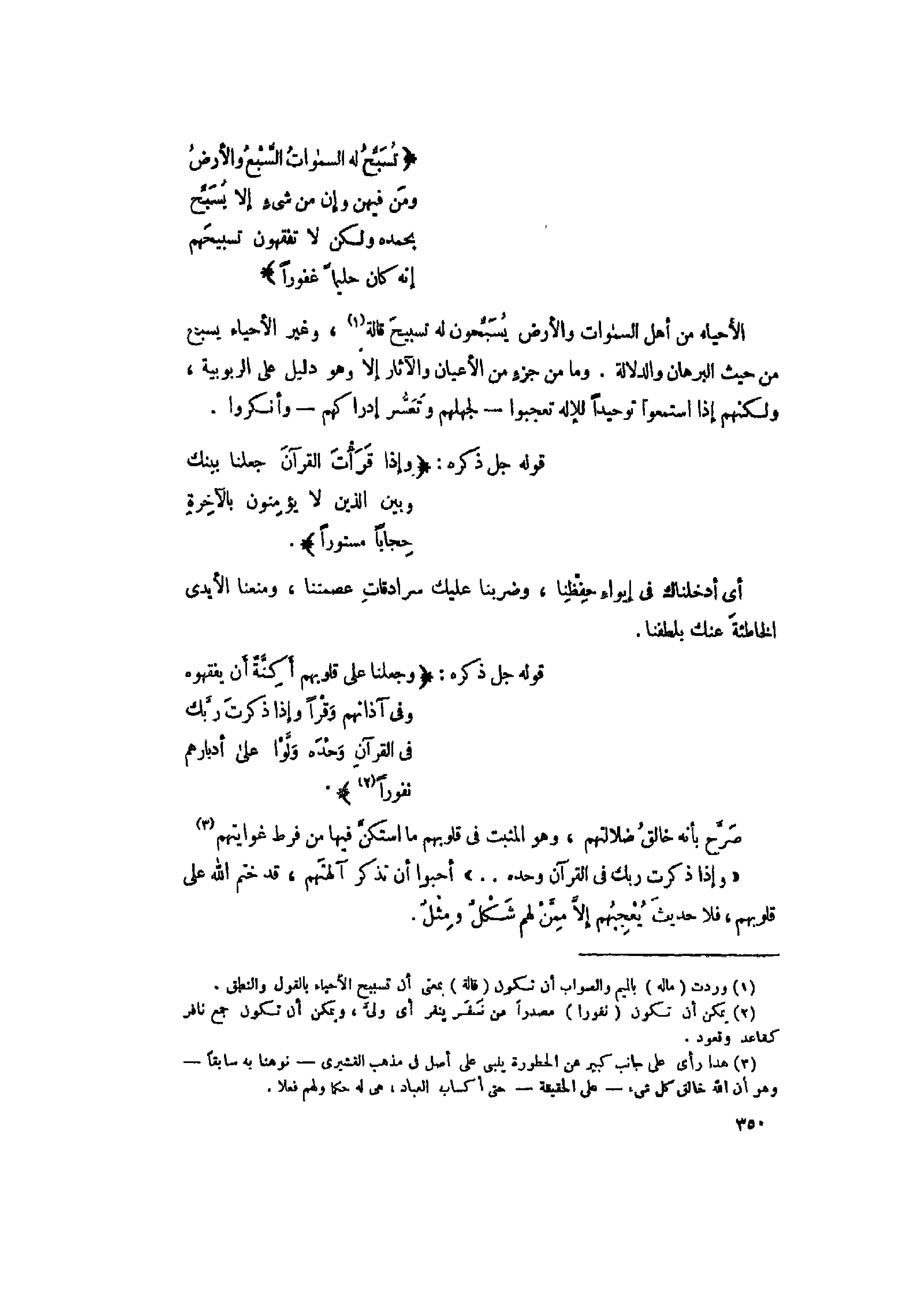 (1) وردت (ماله) بالميم والصواب أن تكون (قالة) بمعنى أن تسبيح الأحياء بالقول والنطق.