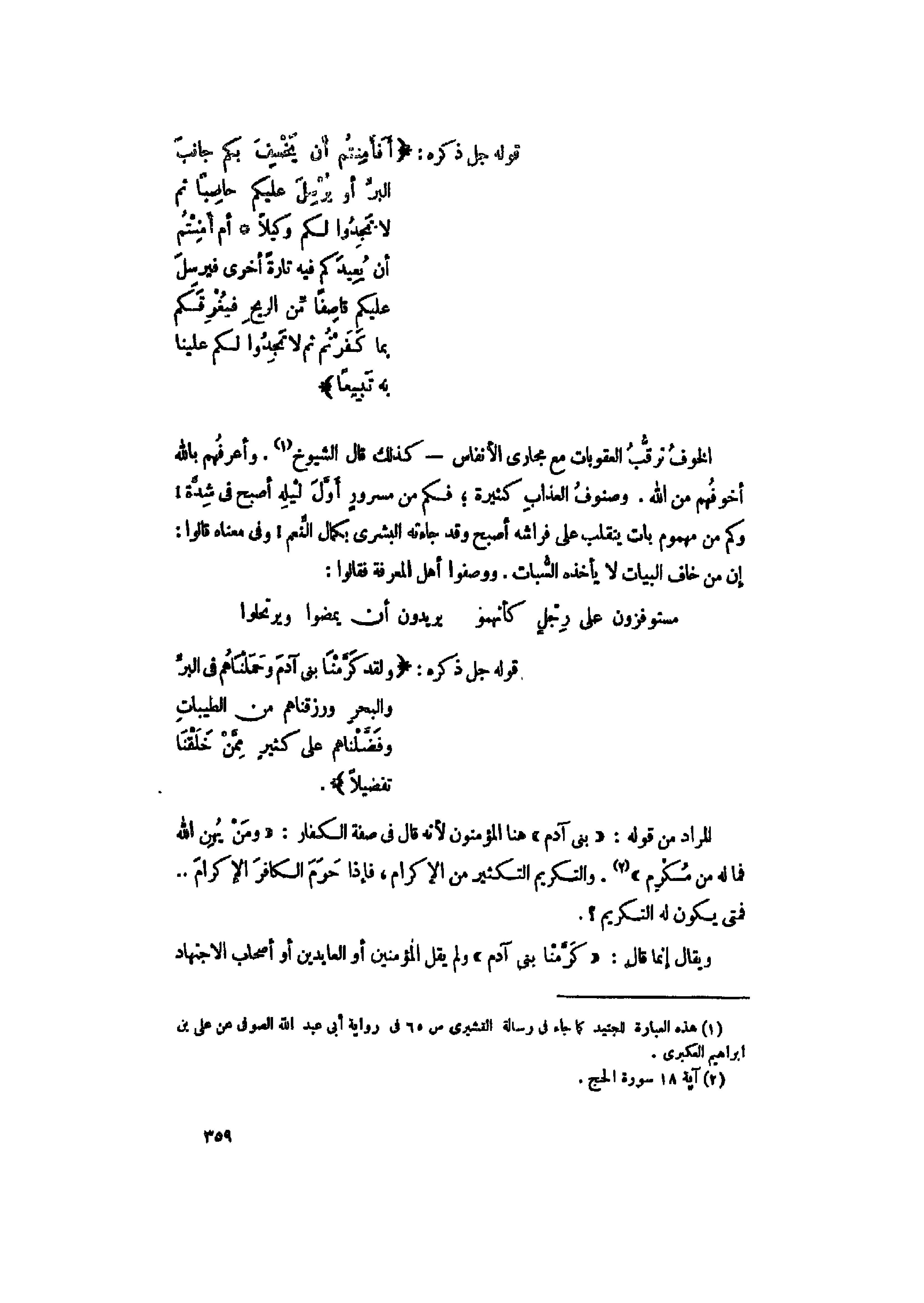 ويقال إنما قال: «كَرَّمْنا بَنِي آدَمَ» ولم يقل المؤمنين أو العابدين أو أصحاب الاجتهاد
