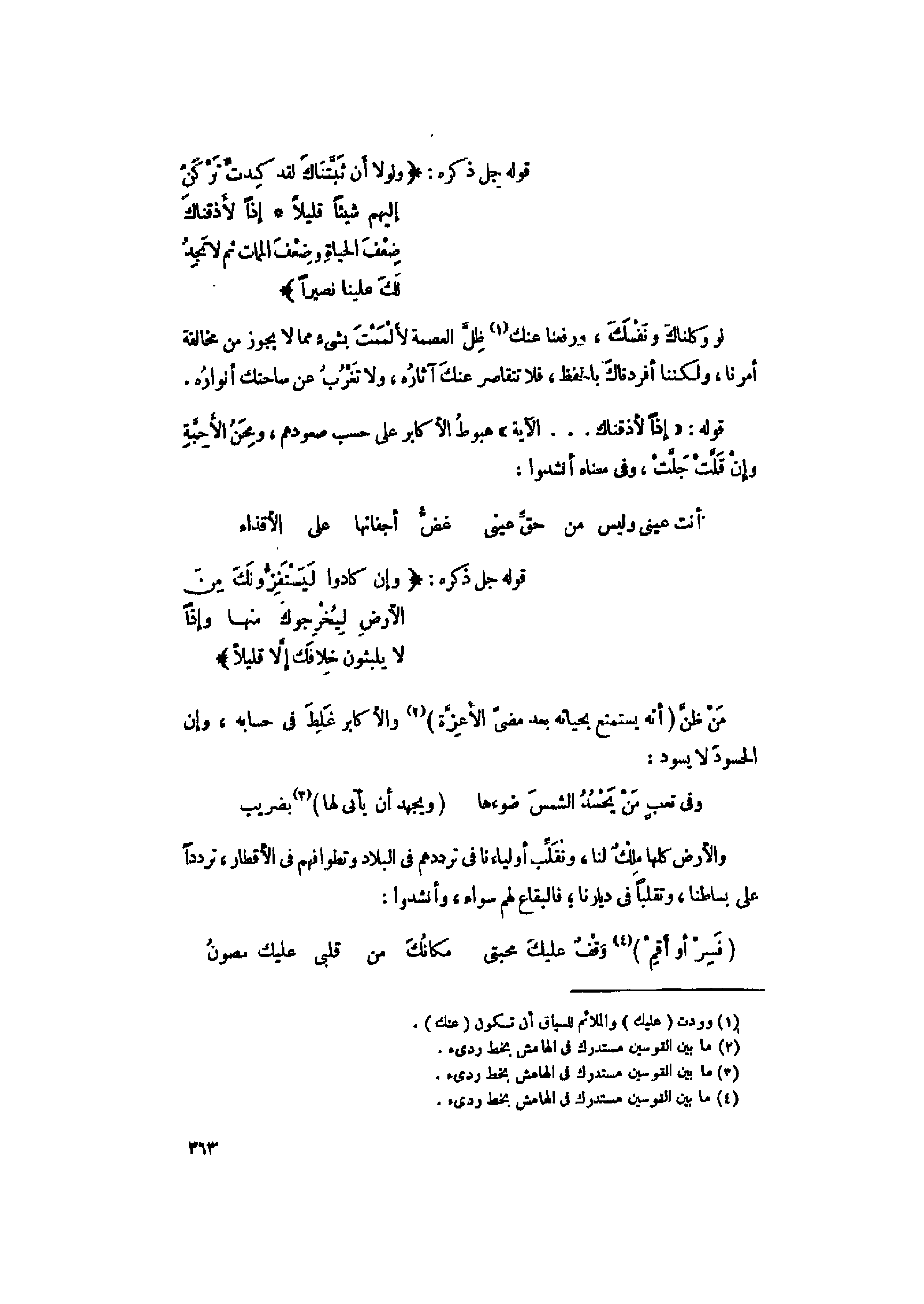 وَلَوْلا أَنْ ثَبَّتْناكَ لَقَدْ كِدْتَ تَرْكَنُ إِلَيْهِمْ شَيْئاً قَلِيلاً (74) إِذاً لَأَذَقْناكَ ضِعْفَ الْحَياةِ وَضِعْفَ الْمَماتِ ثُمَّ لا تَجِدُ لَكَ عَلَيْنا نَصِيراً (75)