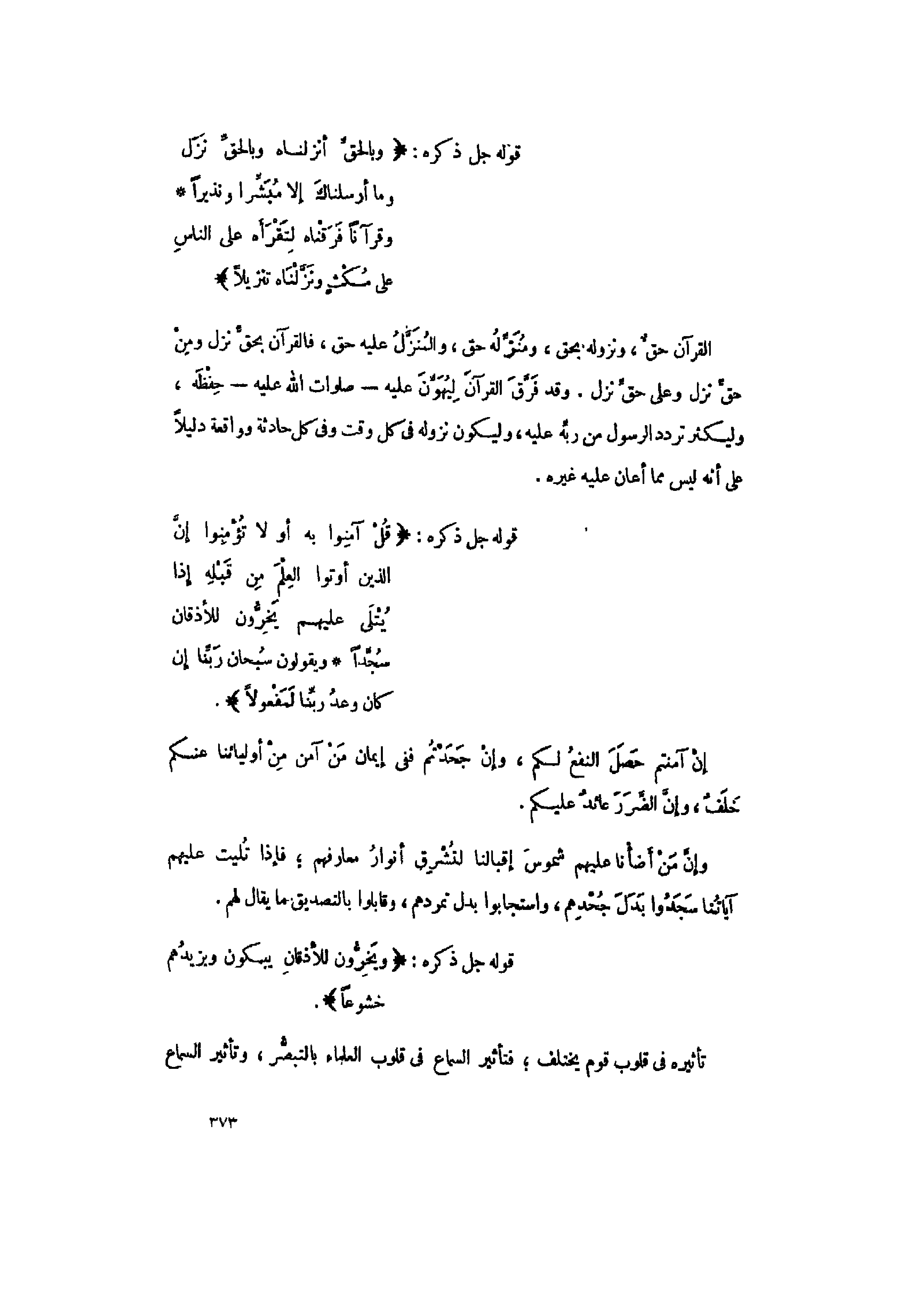 القرآن حقّ، ونزوله بحق، ومنزّله حق، والمنزّل عليه حق، فالقرآن بحقّ نزل ومن حقّ نزل وعلى حقّ نزل، وقد فرّق القرآن ليهوّن عليه- صلوات الله عليه- حفظه، وليكثر تردد الرسول من ربّه عليه، وليكون نزوله فى كل وقت وفى كل حادثة وواقعة دليلا على أنه ليس مما أعان عليه غيره.