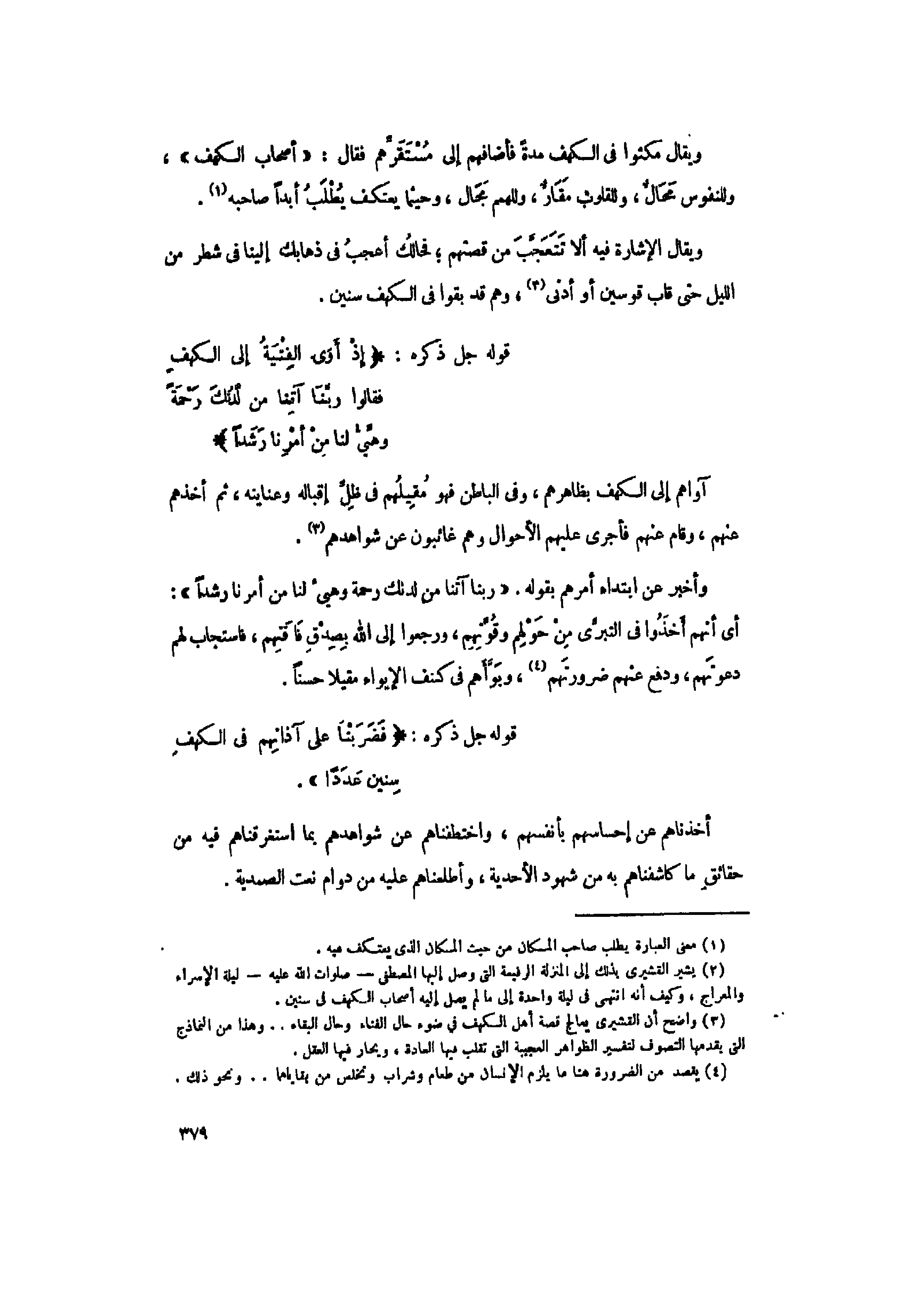 (3) واضح أن القشيري يعالج قصة أهل الكهف في ضوء حال الفناء وحال البقاء.. وهذا من النماذج التي يقدمها التصوف لتفسير الظواهر العجيبة التي تقلب فيها العادة، وبحار فيها العقل.