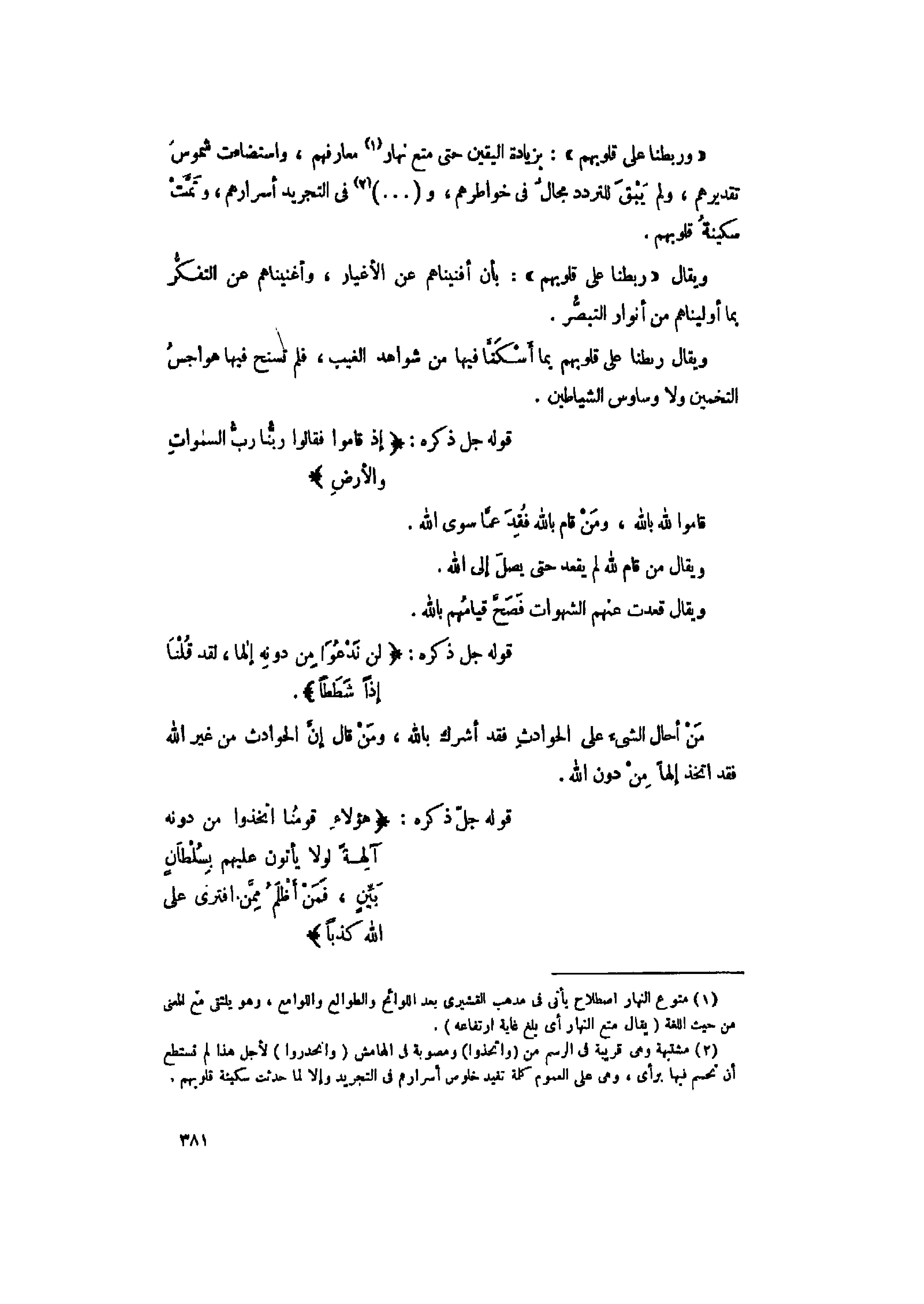 وَرَبَطْنا عَلى قُلُوبِهِمْ: بزيادة اليقين حتى متع نهار «1» معارفهم، واستضاءت شموس تقديرهم، ولم يبق للتردد مجال فى خواطرهم، و ( ... ) «2» فى التجريد أسرارهم، وتمّت سكينة قلوبهم.