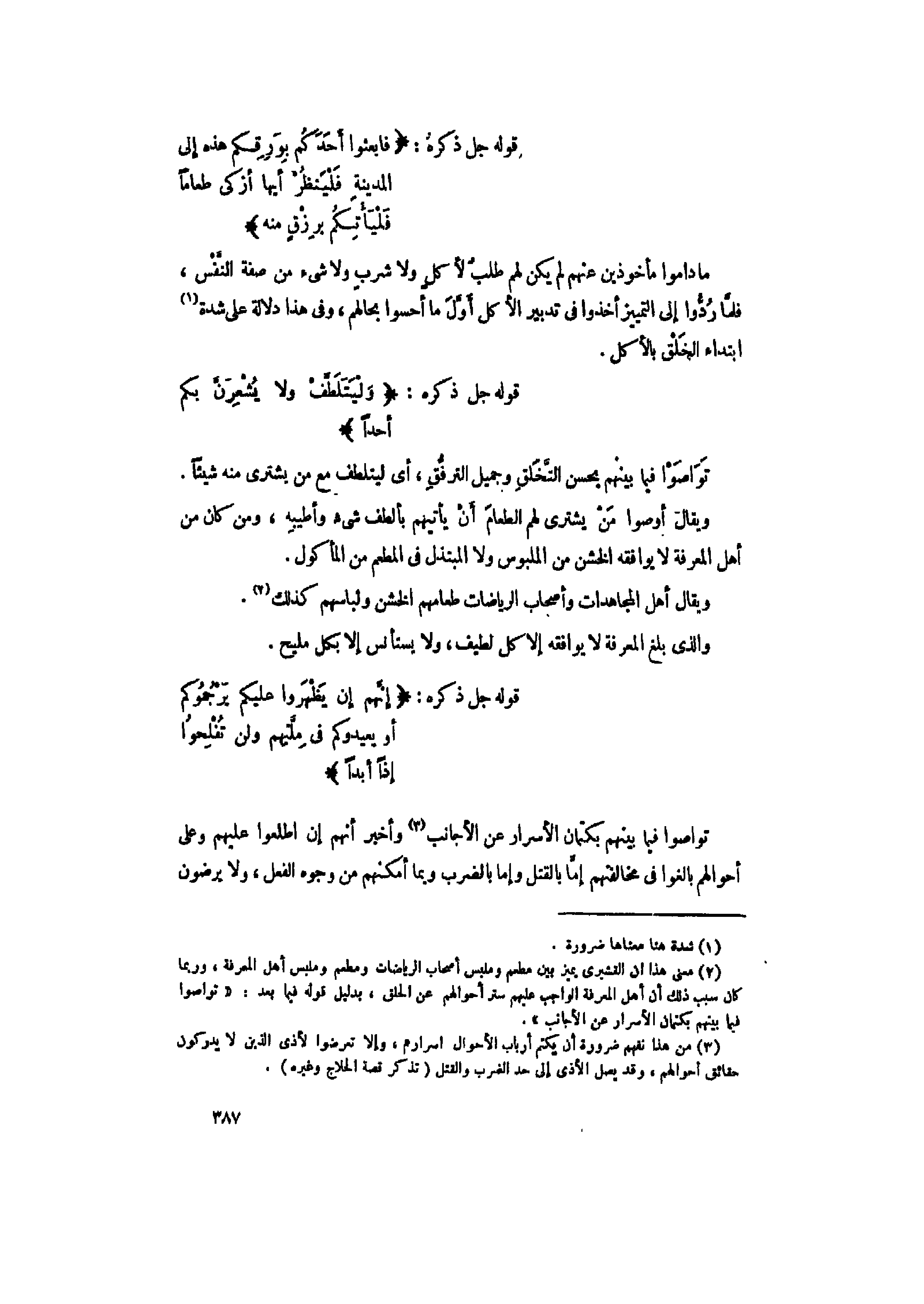 قوله جل ذكره: فَابْعَثُوا أَحَدَكُمْ بِوَرِقِكُمْ هذِهِ إِلَى الْمَدِينَةِ فَلْيَنْظُرْ أَيُّها أَزْكى طَعاماً فَلْيَأْتِكُمْ بِرِزْقٍ مِنْهُ ما داموا مأخوذين عنهم لم يكن لهم طلب لأكل ولا شرب ولا شىء من صفة النّفس، فلمّا ردّوا إلى التمييز أخذوا فى تدبير الأكل أوّل ما أحسوا بحالهم، وفى هذا دلالة على شدة «1» ابتداء الخلق بالأكل.
