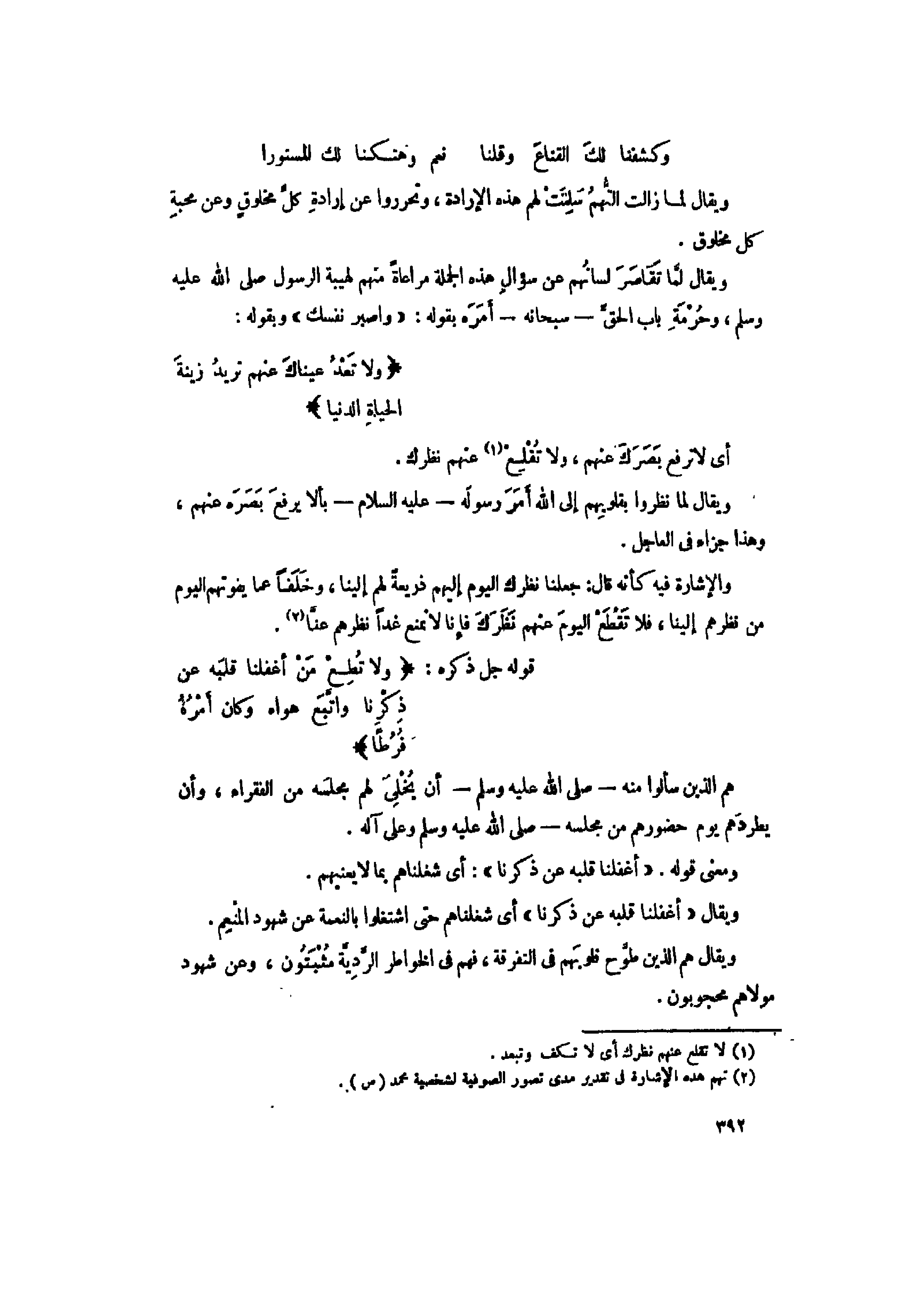قوله جل ذكره: وَلا تُطِعْ مَنْ أَغْفَلْنا قَلْبَهُ عَنْ ذِكْرِنا وَاتَّبَعَ هَواهُ وَكانَ أَمْرُهُ فُرُطاً هم الذين سألوا منه- صلى الله عليه وسلم- أن يخلى لهم مجلسه من الفقراء، وأن يطردهم يوم حضورهم من مجلسه- صلى الله عليه وسلم وعلى آله.