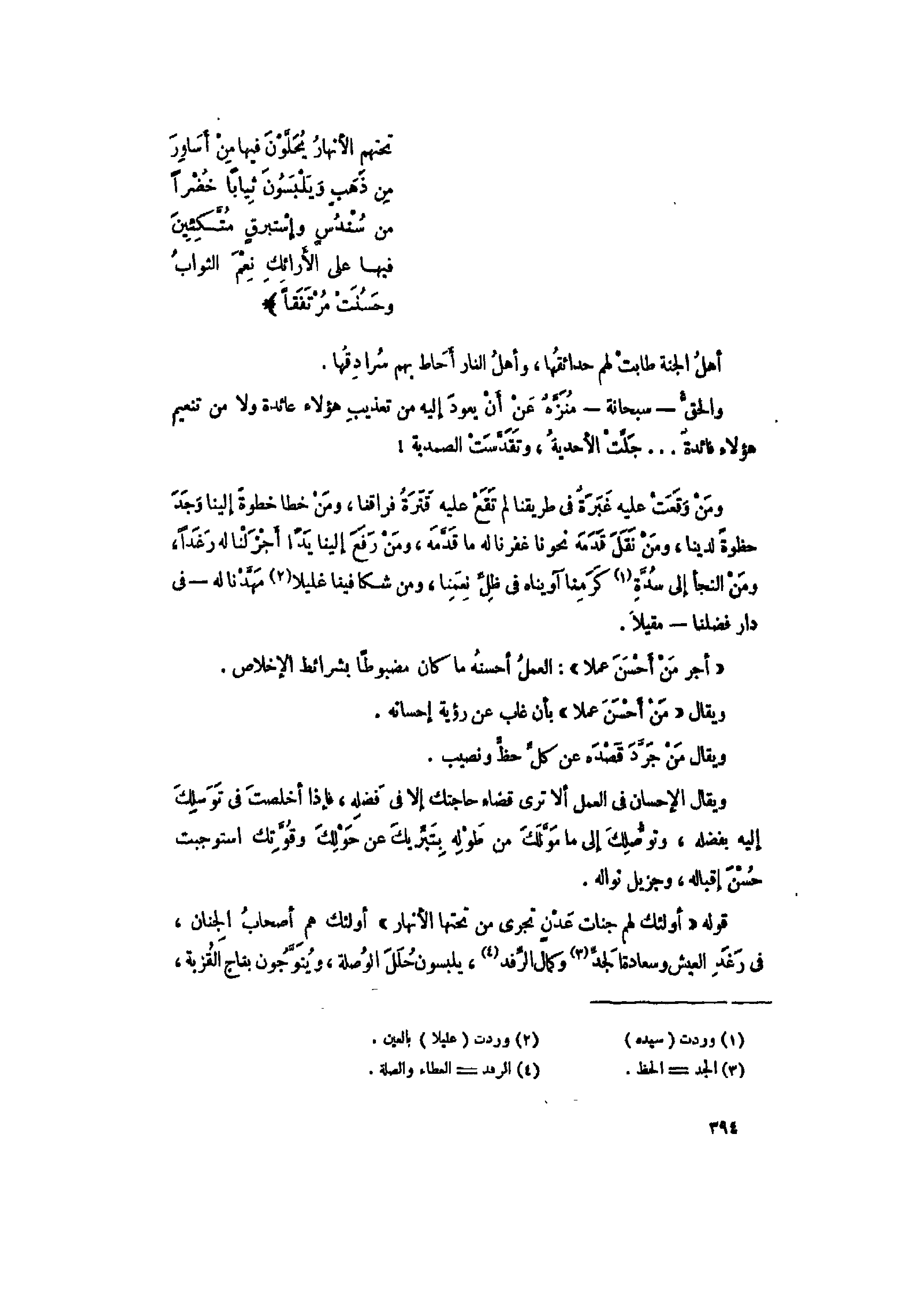 قوله أُولئِكَ لَهُمْ جَنَّاتُ عَدْنٍ تَجْرِي مِنْ تَحْتِهِمُ الْأَنْهارُ أولئك هم أصحاب الجنان، فى رغد العيش وسعادة الجدّ «3» وكمال الرّفد «4» ، يلبسون حلل الوصلة، ويتوّجون بتاج القربة،