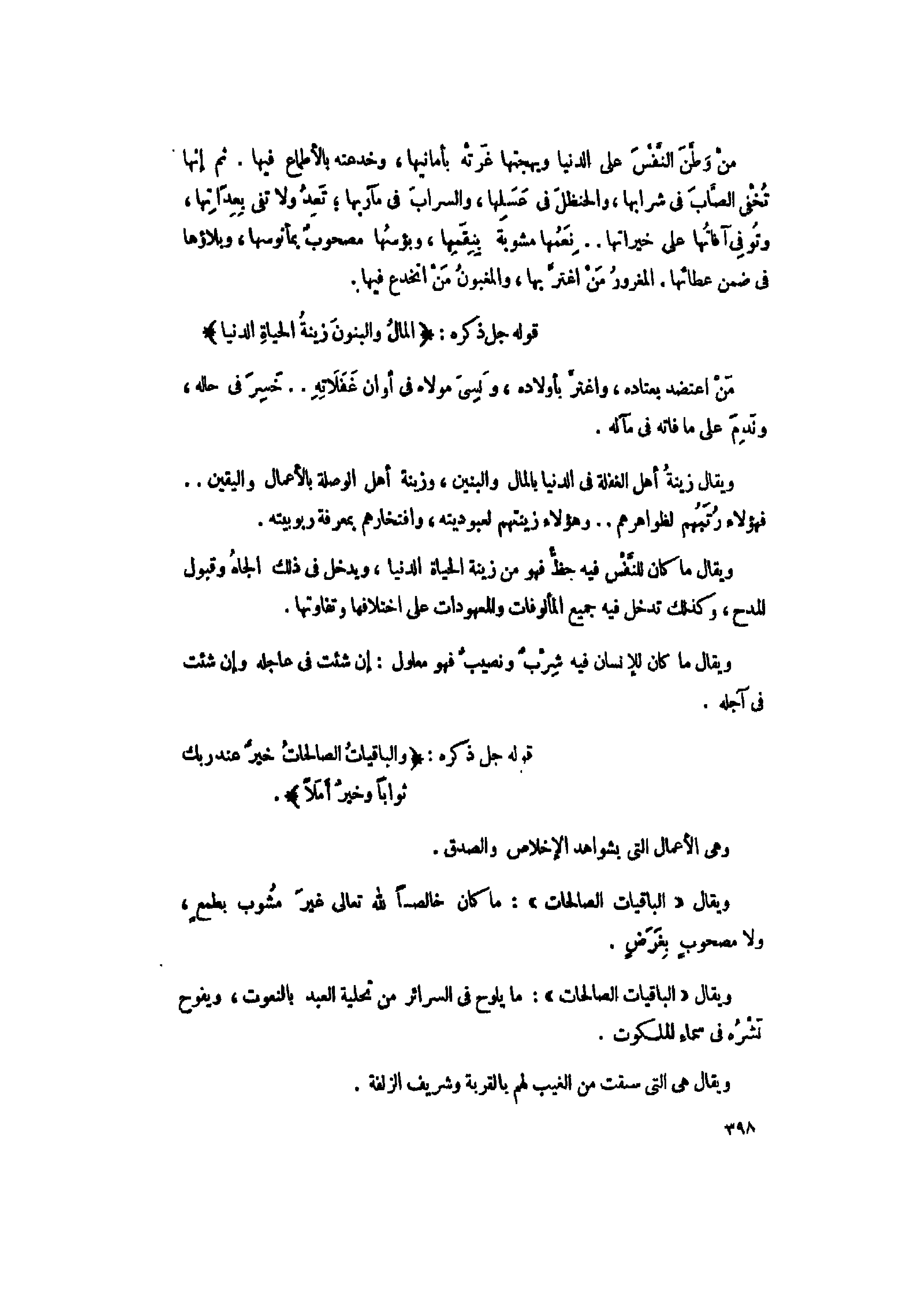 ويقال «الْباقِياتُ الصَّالِحاتُ» : ما كان خالصا لله تعالى غير مشوب بطمع، ولا مصحوب بغرض.