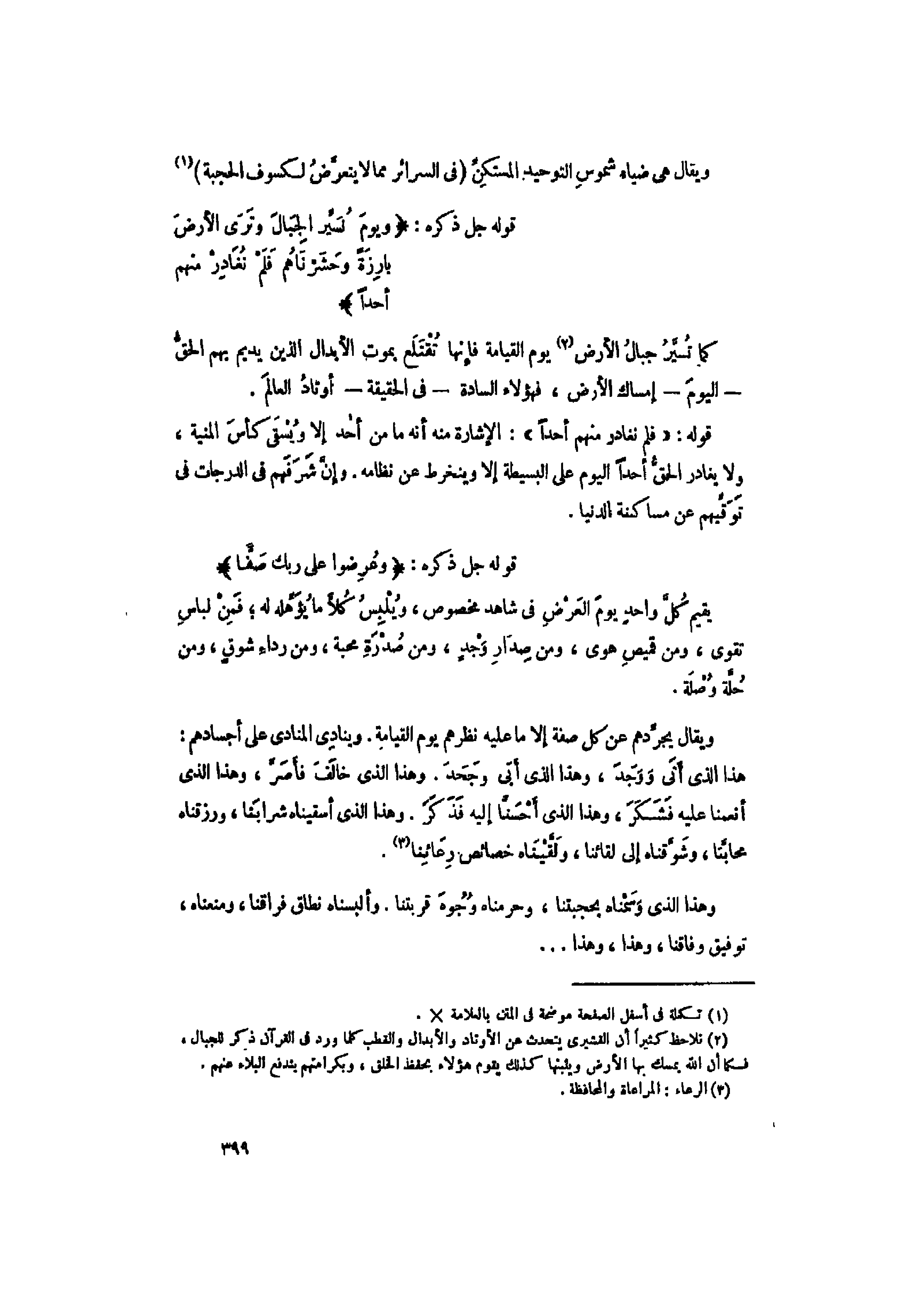 كما تسيّر جبال الأرض «2» يوم القيامة فإنها تقتلع بموت الأبدال الذين يديم بهم الحقّ- اليوم- إمساك الأرض، فهؤلاء السادة- فى الحقيقة- أوتاد العالم.