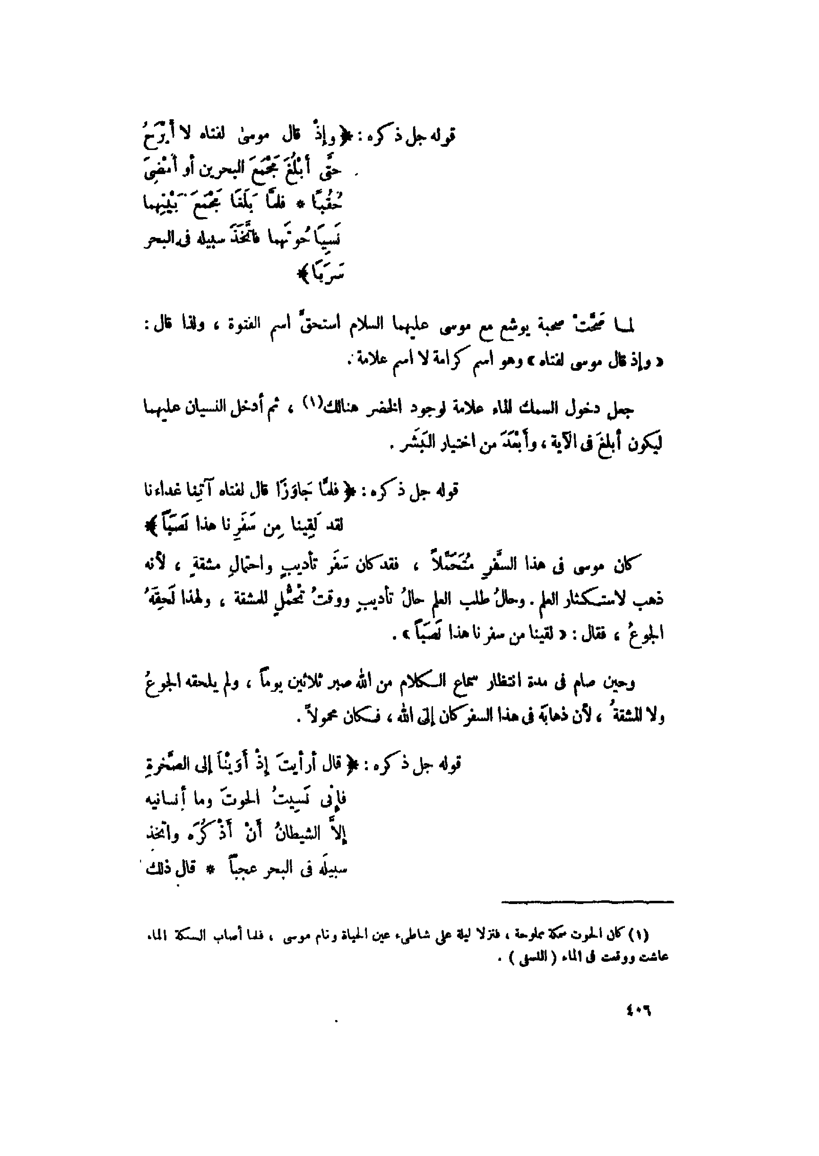 (1) كان الحوت سمكة مملوحة، فنزلا ليلة على شاطىء عين الحياة ونام موسى، فلما أصاب السكة الماء عاشت ووقعت فى الماء (النسفي) .