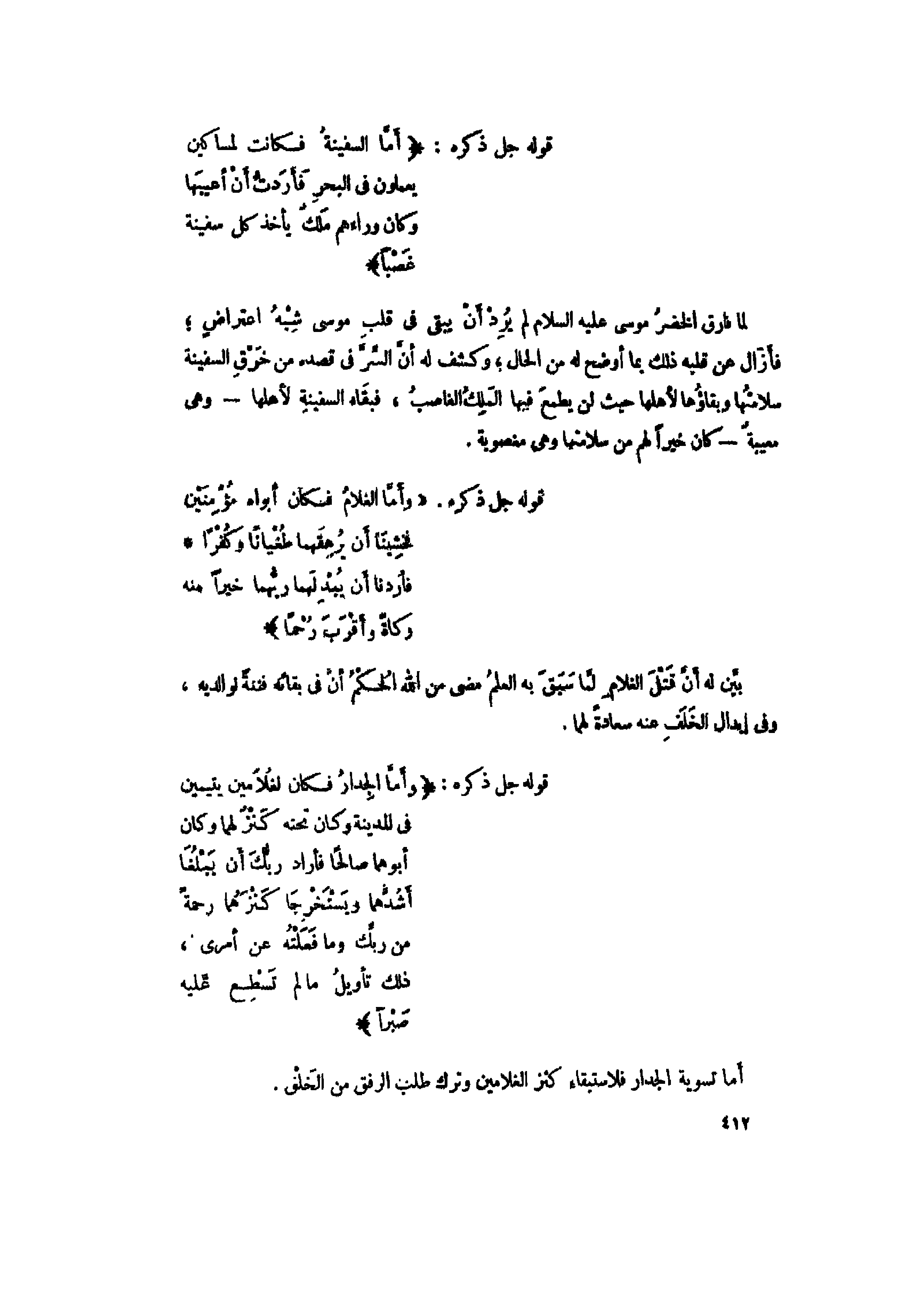 لما فارق الخضر موسى عليه السلام لم يرد أن يبقى فى قلب موسى شبه اعتراض فأزال عن قلبه ذلك بما أوضح له من الحال، وكشف له أنّ السّرّ فى قصده من خرق السفينة سلامتها وبقاؤها لأهلها حيث لن يطمع فيها الملك الغاصب، فبقاء السفينة لأهلها- وهى مصيبة- كان خيرا لهم من سلامتها وهى مغضوبة.