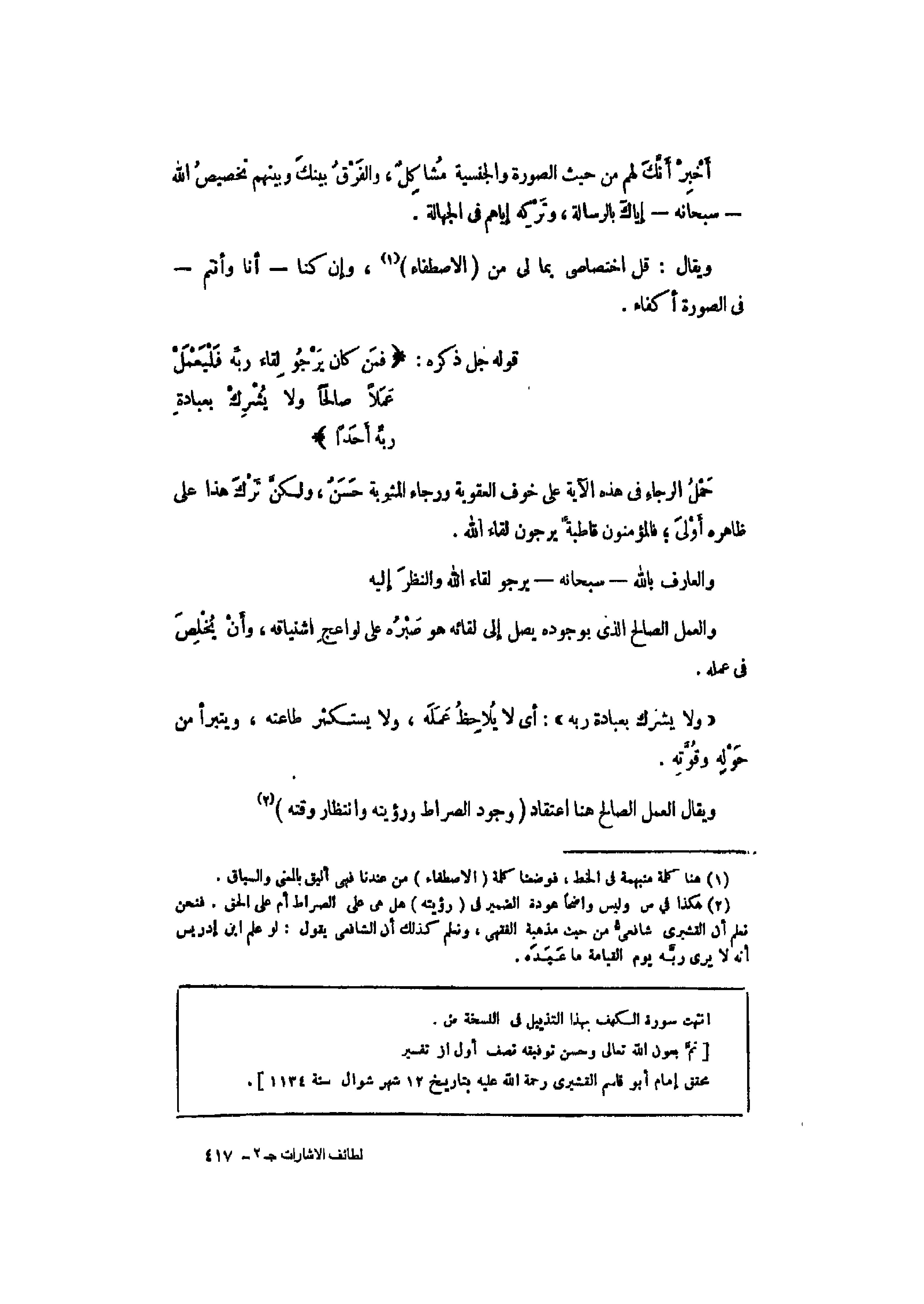 [تمّ بعون الله تعالى وحسن توفيقه نصف أول از تفسير محقق إمام أبو قاسم القشيري رحمة الله عليه بتاريخ 12 شهر شوال سنة 1134] .