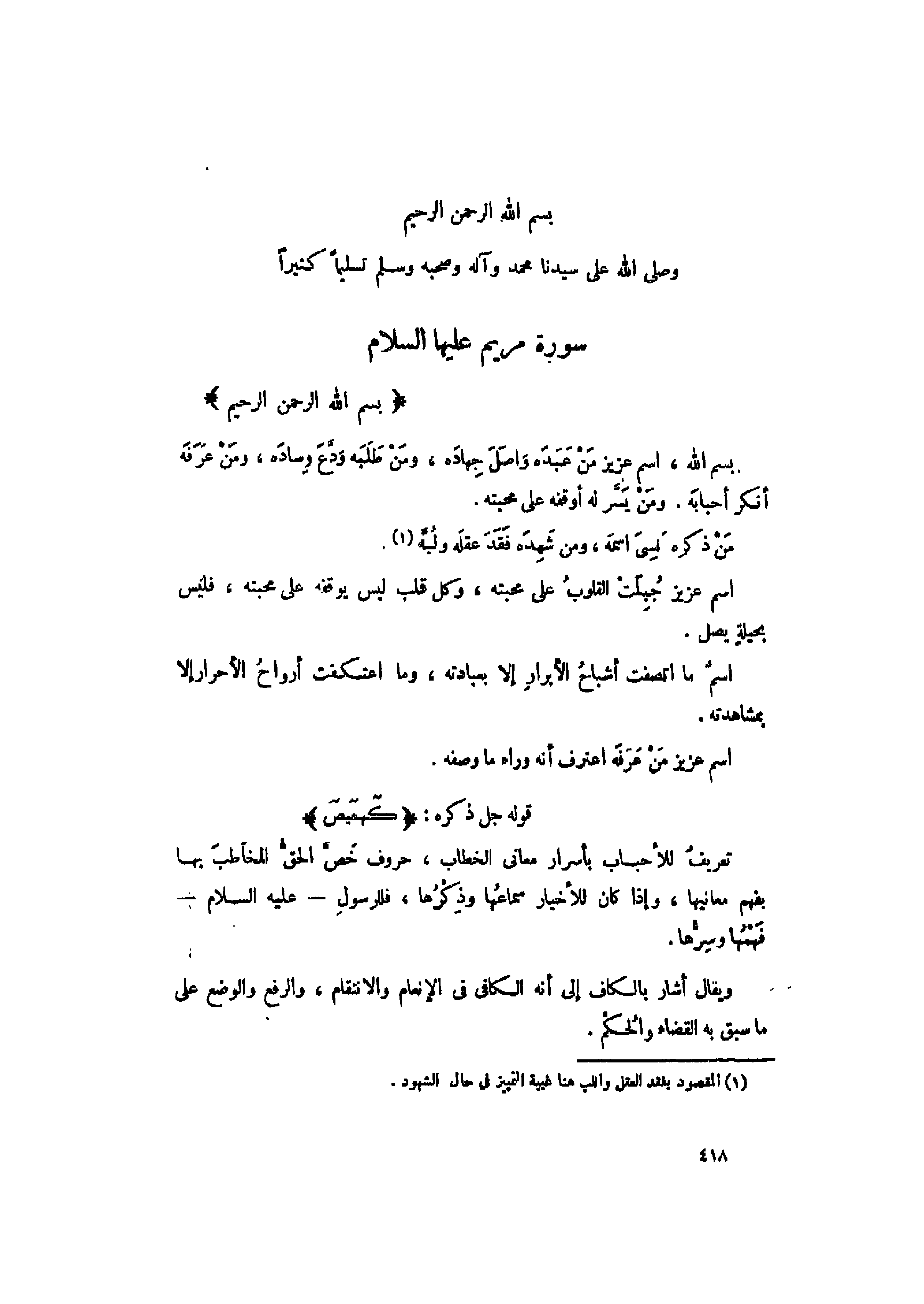 بِسْمِ اللَّهِ الرَّحْمنِ الرَّحِيمِ بسم الله، اسم عزيز من عبده واصل جهاده، ومن طلبه ودّع وساده، ومن عرفه أنكر أحبابه. ومن يسّر له أوقفه على محبته.