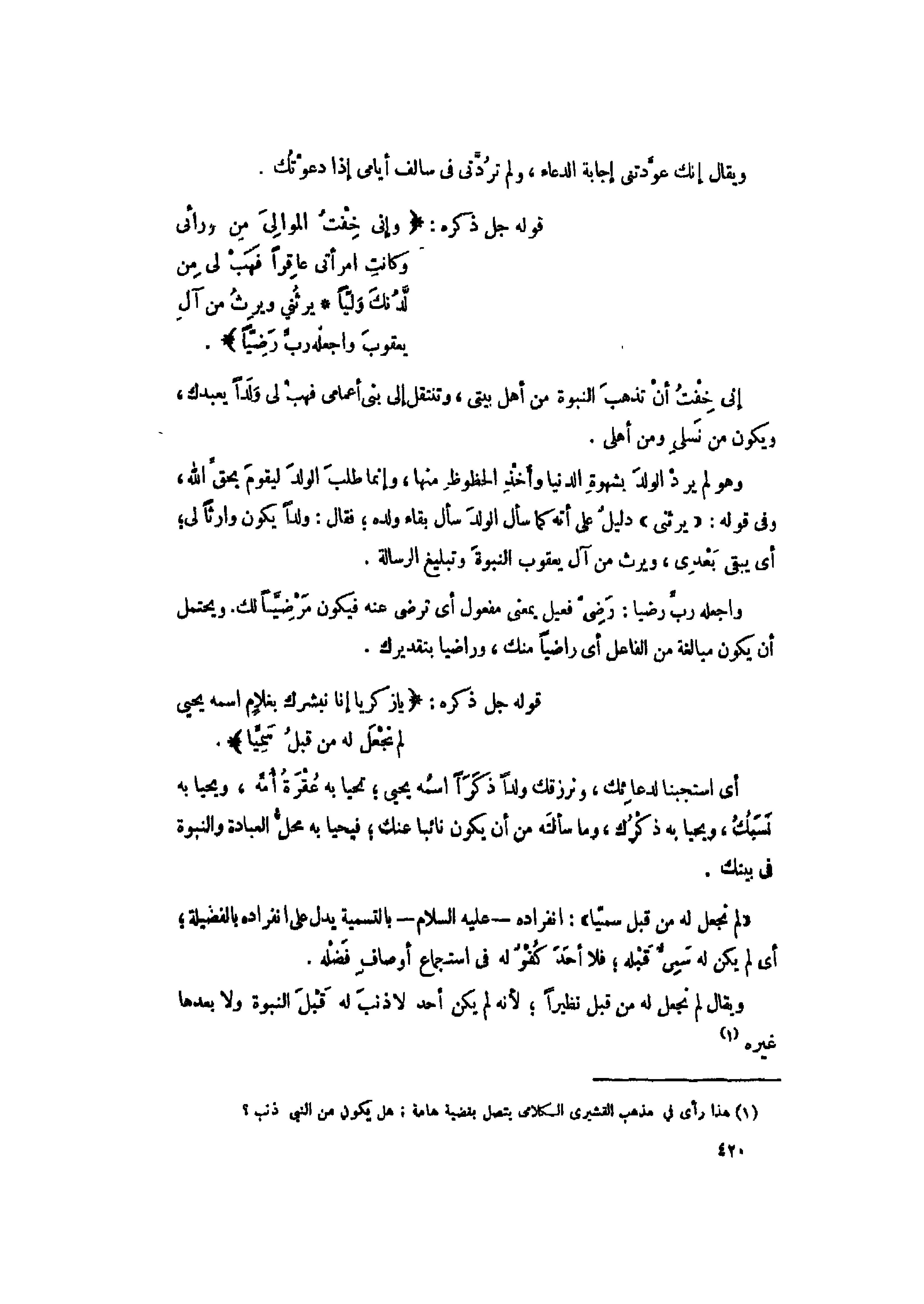 وهو لم يرد الولد بشهوتة الدنيا وأخذ الحظوظ منها، وإنما طلب الولد ليقوم بحقّ الله، وفى قوله: «يَرِثُنِي» دليل على أنه كما سأل الولد سأل بقاء ولده فقال: ولدا يكون وارثا لى أي يبقى بعدي، ويرث من آل يعقوب النبوة وتبليغ الرسالة.