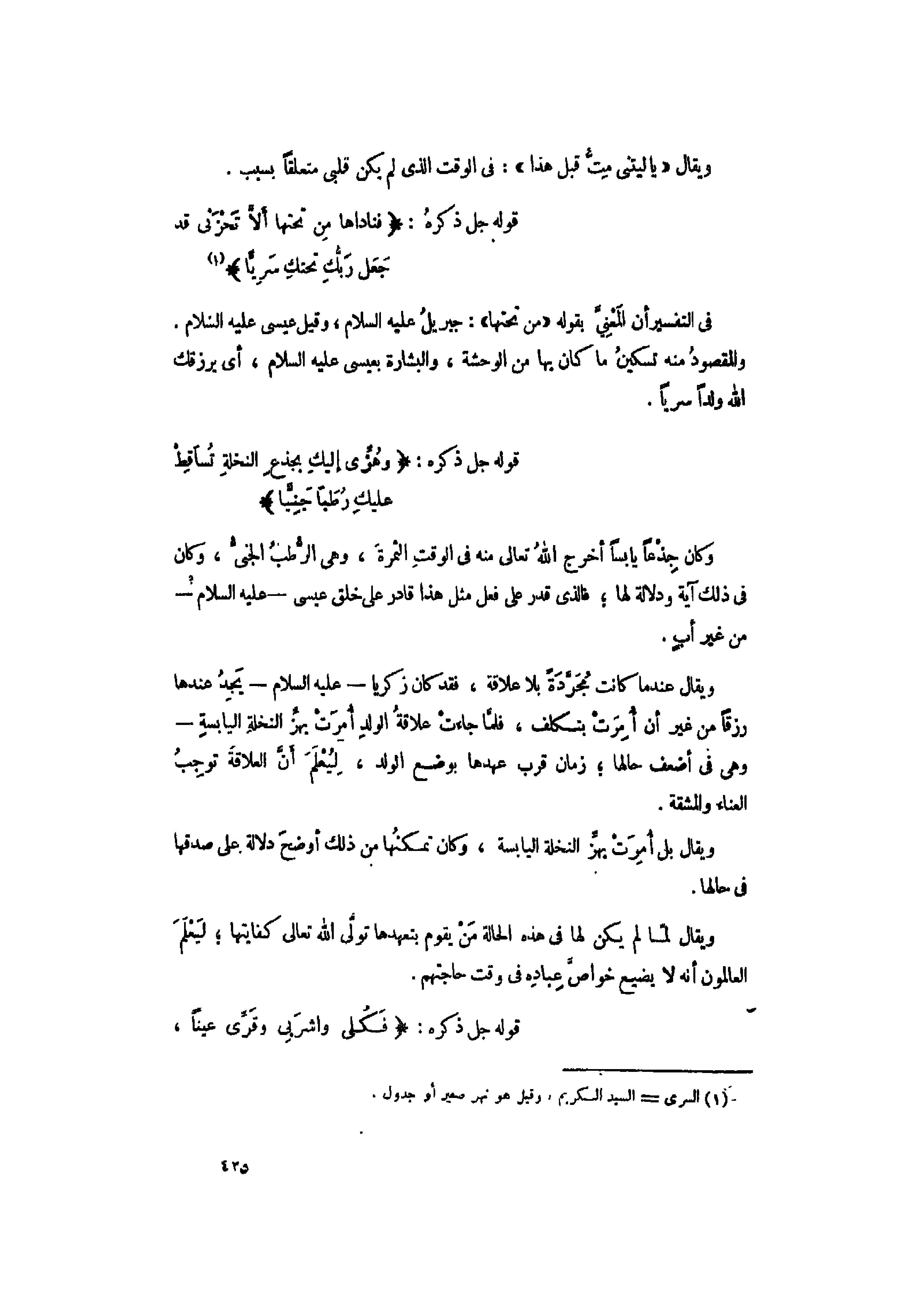 «1» فى التفسير أنّ المعنيّ بقوله «مِنْ تَحْتِها» : جبريل عليه السلام، وقيل عيسى عليه السلام.