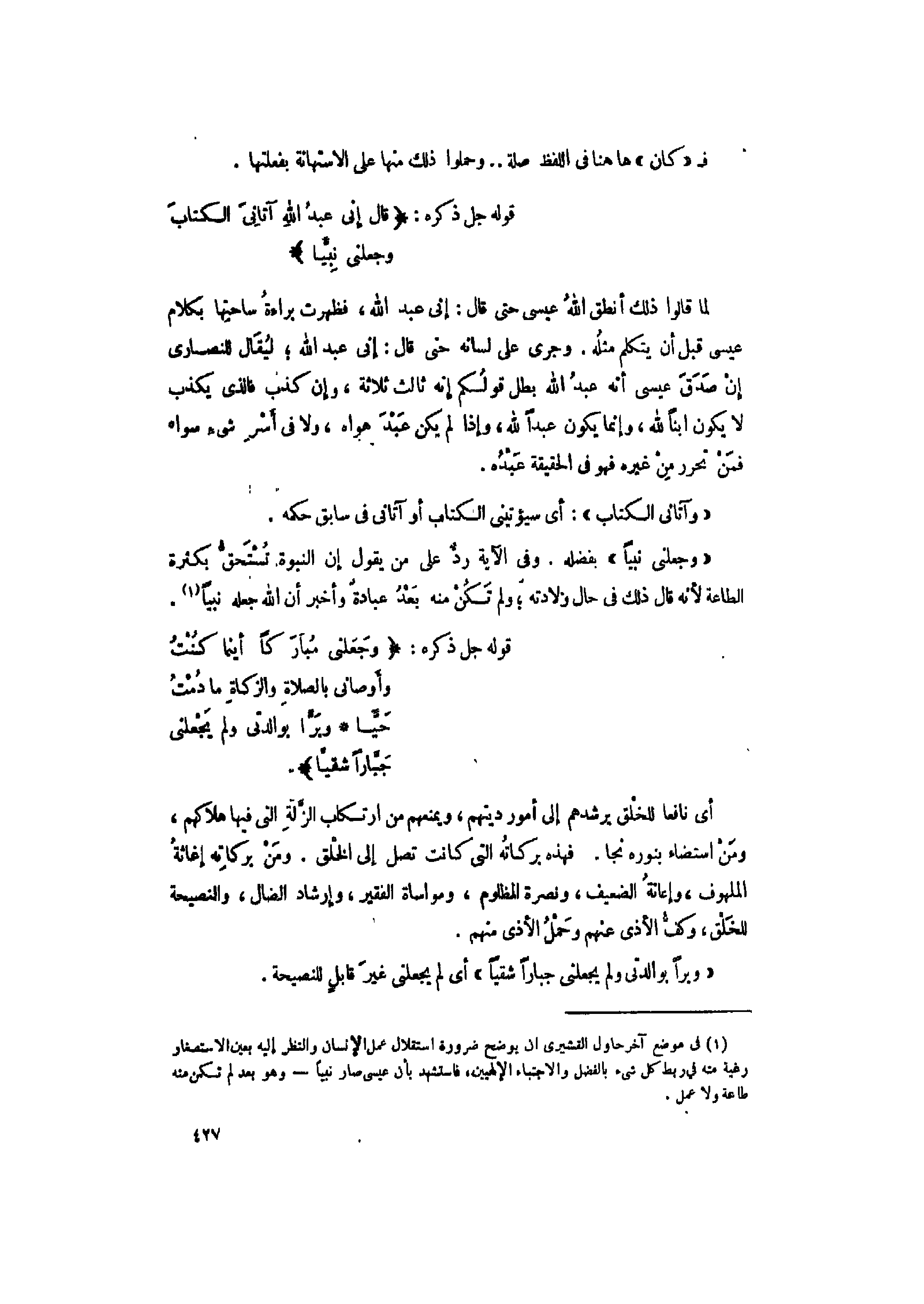 لما قالوا ذلك أنطق الله عيسى حتى قال: إنى عبد الله، فظهرت براءة ساحتها بكلام عيسى قبل أن يتكلم مثله. وجرى على لسانه حتى قال: إنى عبد الله ليقال للنصارى إن صدق عيسى أنه عبد الله بطل قولكم إنه ثالث ثلاثة، وإن كذب فالذى يكذب لا يكون ابنا لله، وإنما يكون عبدا لله، وإذا لم يكن عبد هواه، ولا فى أسر شىء سواه فمن تحرر من غيره فهو فى الحقيقة عبده.