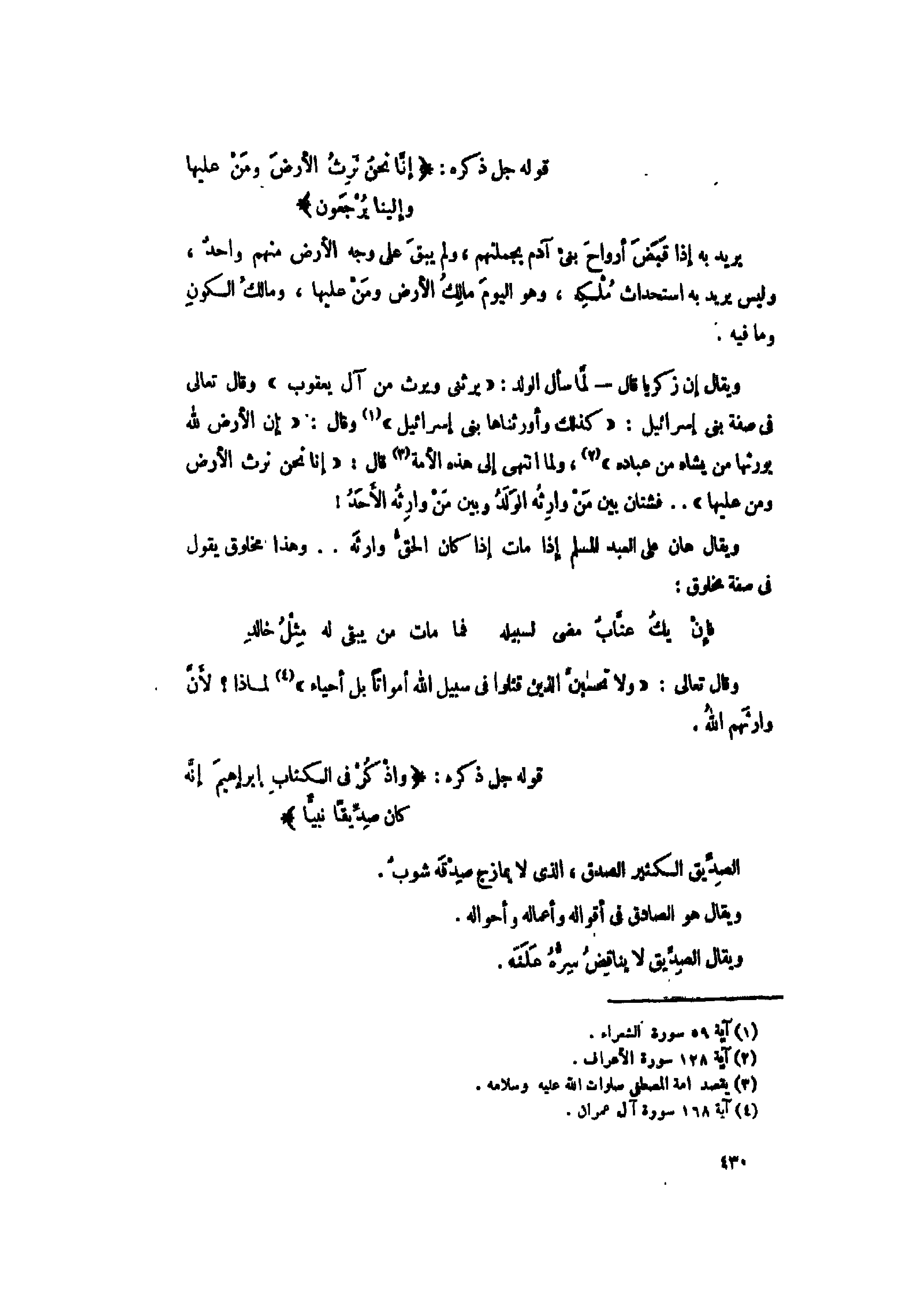 ويقال إن زكريا قال- لمّا سأل الولد: «يَرِثُنِي وَيَرِثُ مِنْ آلِ يَعْقُوبَ» وقال تعالى فى صفة بنى إسرائيل: «كَذلِكَ وَأَوْرَثْناها بَنِي إِسْرائِيلَ» «1» وقال: «إِنَّ الْأَرْضَ لِلَّهِ يُورِثُها مَنْ يَشاءُ مِنْ عِبادِهِ» «2» ، ولما انتهى إلى هذه الأمة «3» قال: «إِنَّا نَحْنُ نَرِثُ الْأَرْضَ وَمَنْ عَلَيْها» .. فشتان بين من وارثه الولد وبين من وارثه الأحد! ويقال هان على العبد المسلم إذا مات إذا كان الحقّ وارثه.. وهذا مخلوق يقول فى صفة مخلوق: