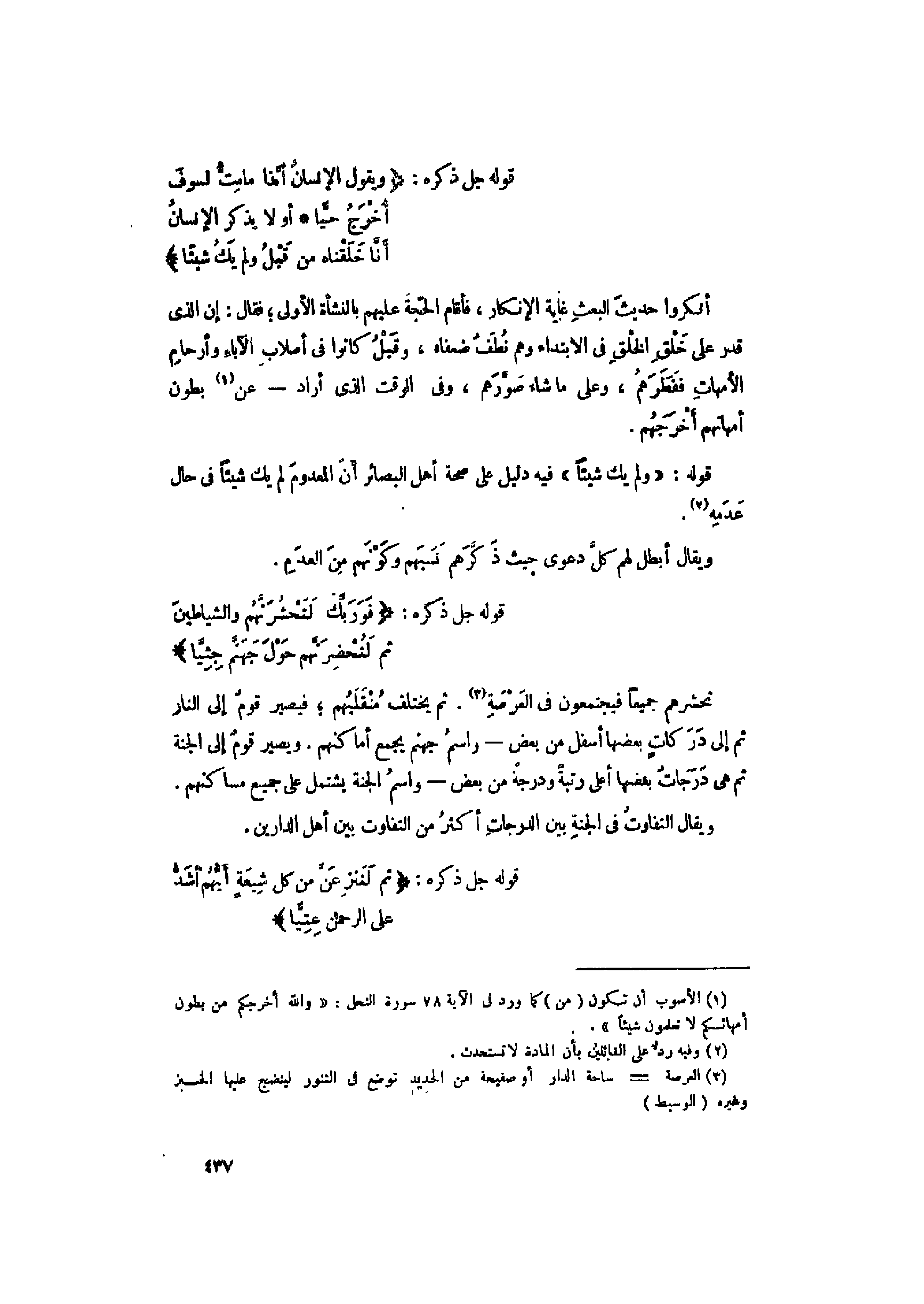 قوله: «وَلَمْ يَكُ شَيْئاً» فيه دليل على صحة أهل البصائر أنّ المعدوم لم يك شيئا فى حال عدمه «2» .