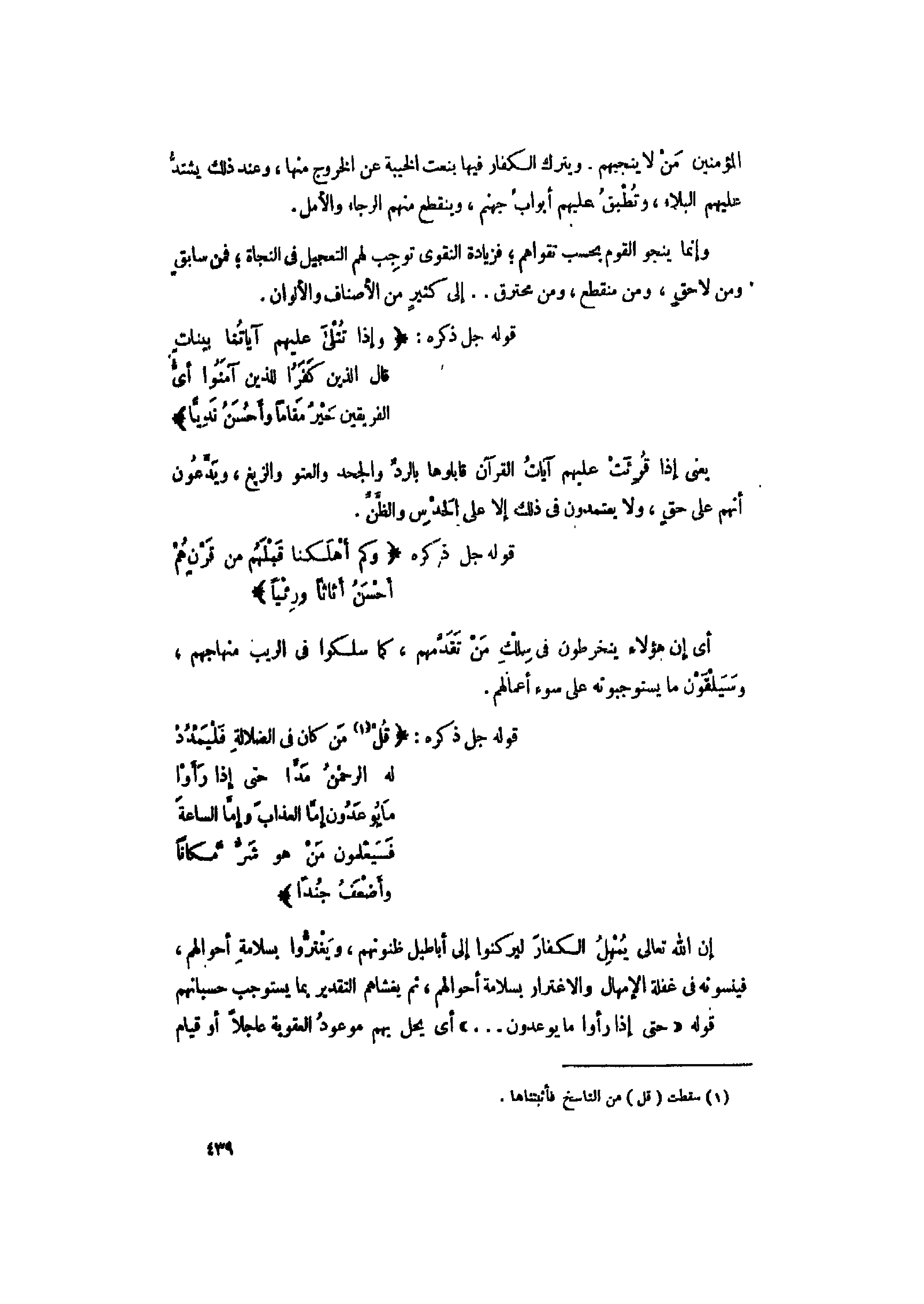«1» إن الله تعالى يمهل الكفار ليركنوا إلى أباطيل ظنونهم، ويغترّوا بسلامة أحوالهم، فينسونه فى غفلة الإمهال والاغترار بسلامة أحوالهم، ثم يغشاهم التقدير بما يستوجب حسبانهم قوله «حَتَّى إِذا رَأَوْا ما يُوعَدُونَ ... » أي يحل بهم موعود العقوبة عاجلا أو قيام