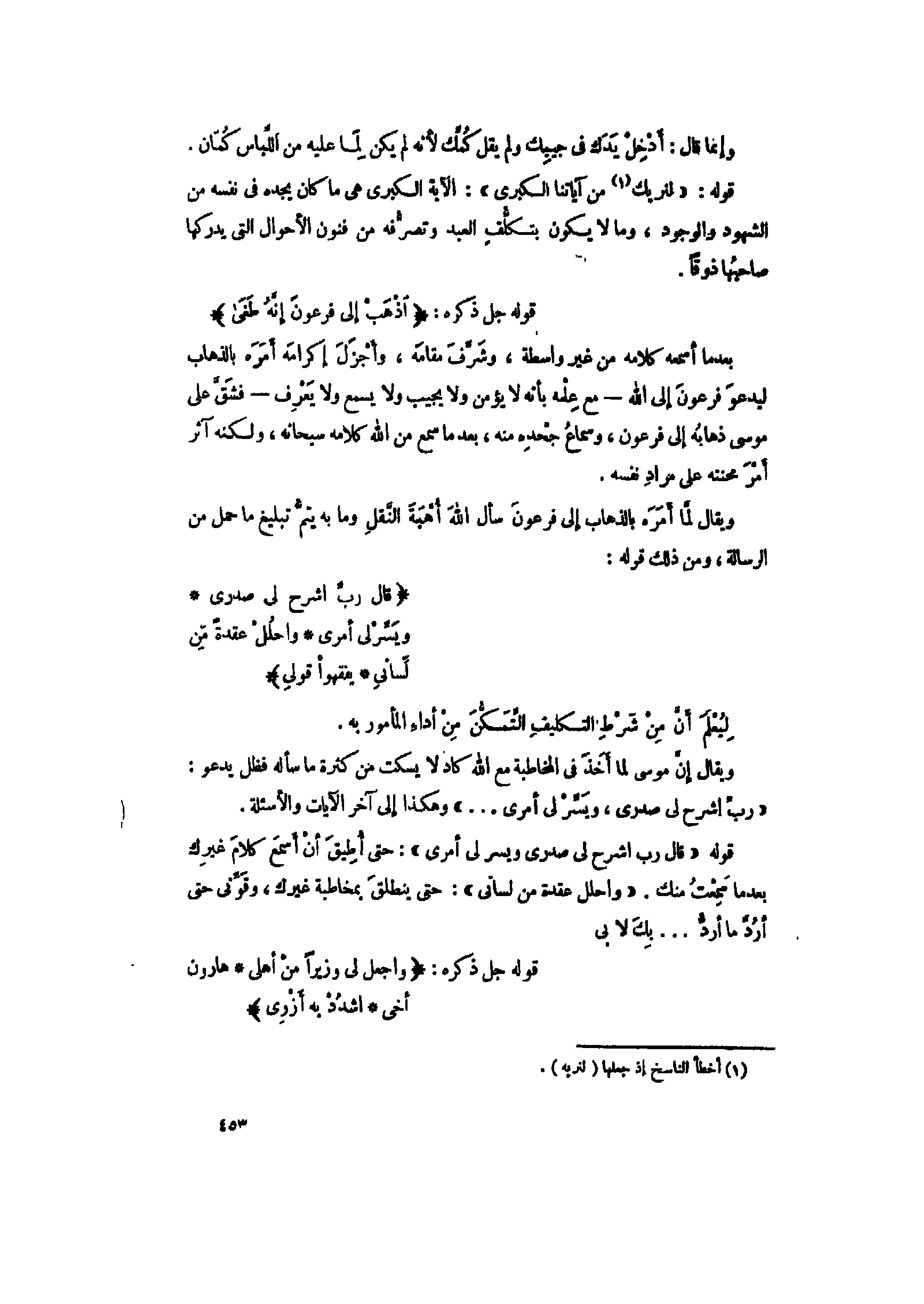 قوله «قالَ رَبِّ اشْرَحْ لِي صَدْرِي وَيَسِّرْ لِي أَمْرِي» : حتى أطيق أن أسمع كلام غيرك بعد ما سمعت منك. «وَاحْلُلْ عُقْدَةً مِنْ لِسانِي» : حتى ينطلق بمخاطبة غيرك، وقوّنى حتى أردّ ما أردّ ... بك لا بي قوله جل ذكره: