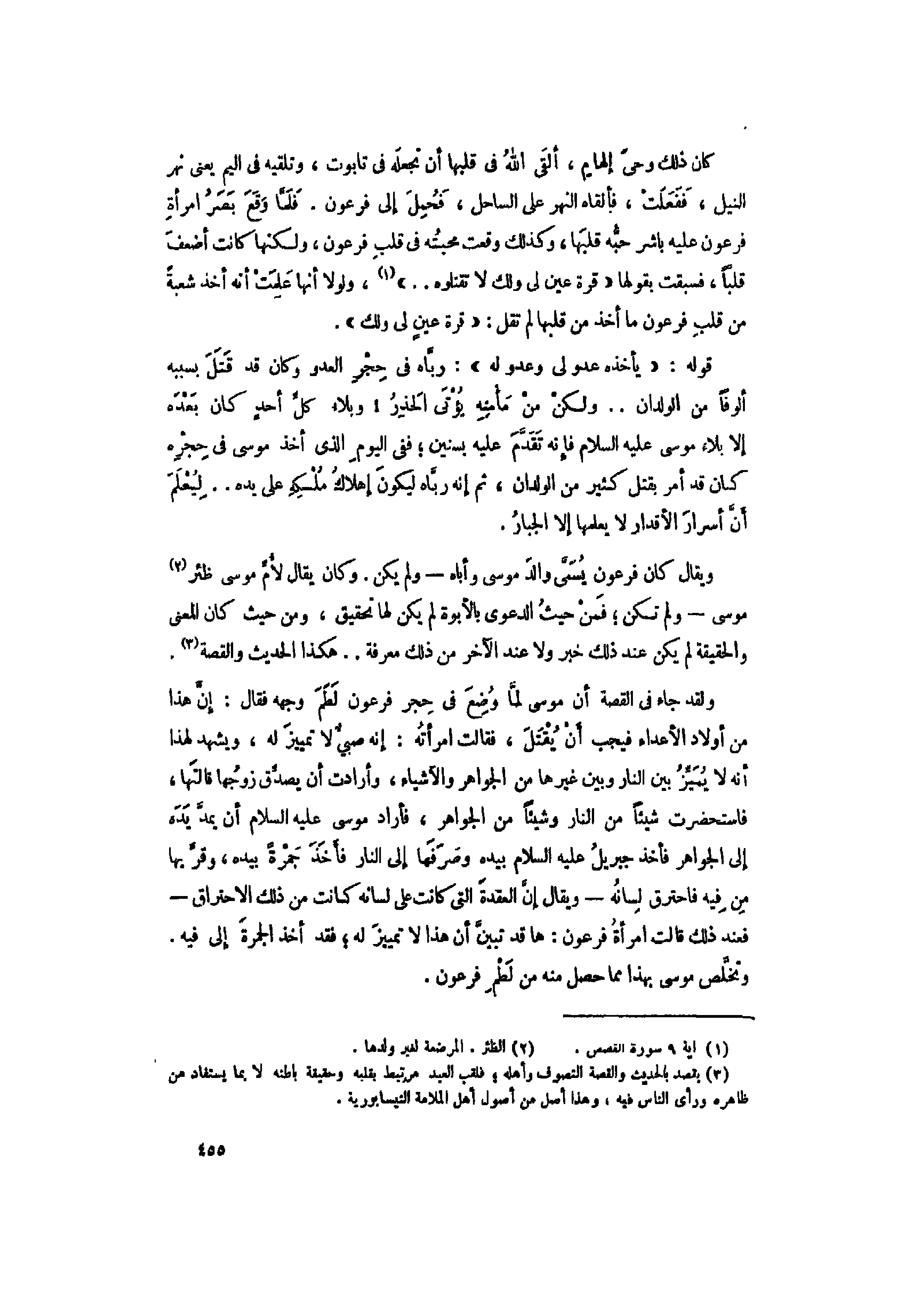 كان ذلك وحي إلهام، ألقى الله فى قلبها أن تجعله فى تابوت، وتلقيه فى اليم يعنى نهر النيل، ففعلت، فألقاه النهر على الساحل، فحمل إلى فرعون. فلمّا وقع بصر امرأة فرعون عليه باشر حبّه قلبها، وكذلك وقعت محبته فى قلب فرعون، ولكنها كانت أضعف قلبا، فسبقت بقولها «قُرَّتُ عَيْنٍ لِي وَلَكَ لا تَقْتُلُوهُ..» «1» ، ولولا أنها علمت أنه أخذ شعبة من قلب فرعون ما أخذ من قلبها لم تقل: «قُرَّتُ عَيْنٍ لِي وَلَكَ» .