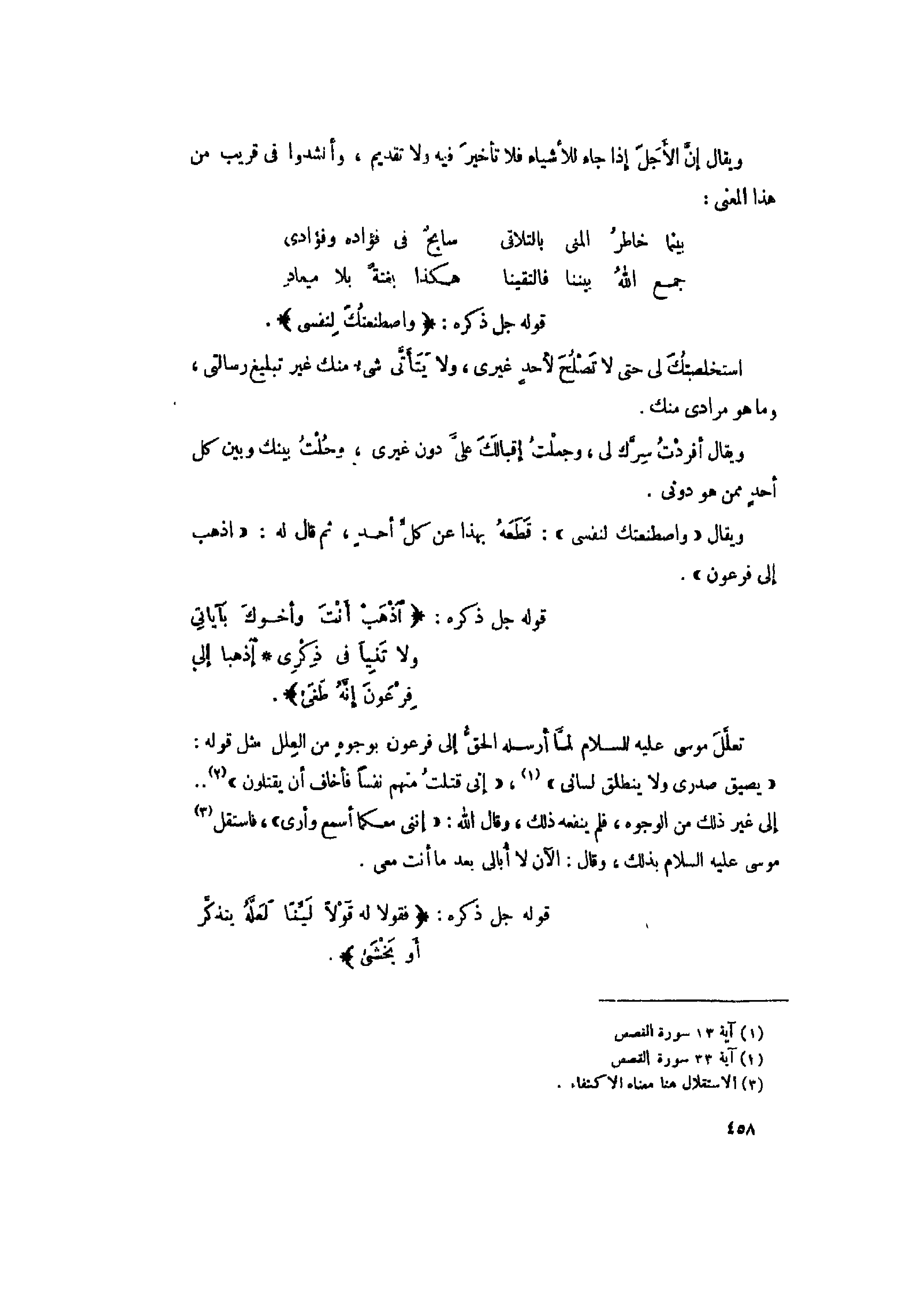 إلى غير ذلك من الوجوه، فلم ينفعه ذلك، وقال الله: «إِنَّنِي مَعَكُما أَسْمَعُ وَأَرى» ، فاستقل «3» موسى عليه السلام بذلك، وقال: الآن لا أبالى بعد ما أنت معى.