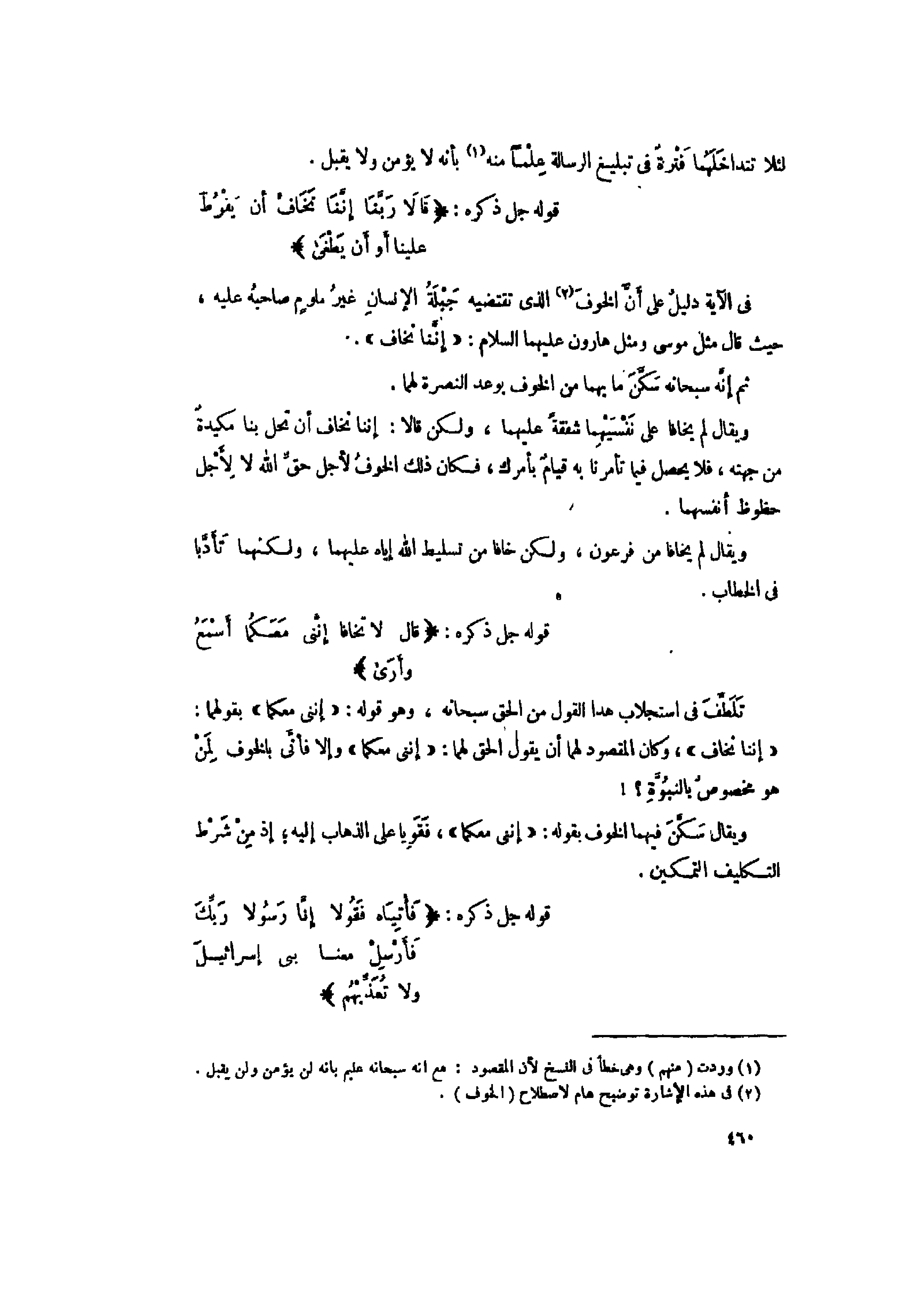 «إِنَّنا نَخافُ» ، وكان المقصود لهما أن يقول الحق لهما: «إِنَّنِي مَعَكُما» وإلا فأنّى بالخوف لمن هو مخصوص بالنبوّة؟! ويقال سكّن فيهما الخوف بقوله: «إِنَّنِي مَعَكُما» ، فقويا على الذهاب إليه إذ من شرط التكليف التمكين.