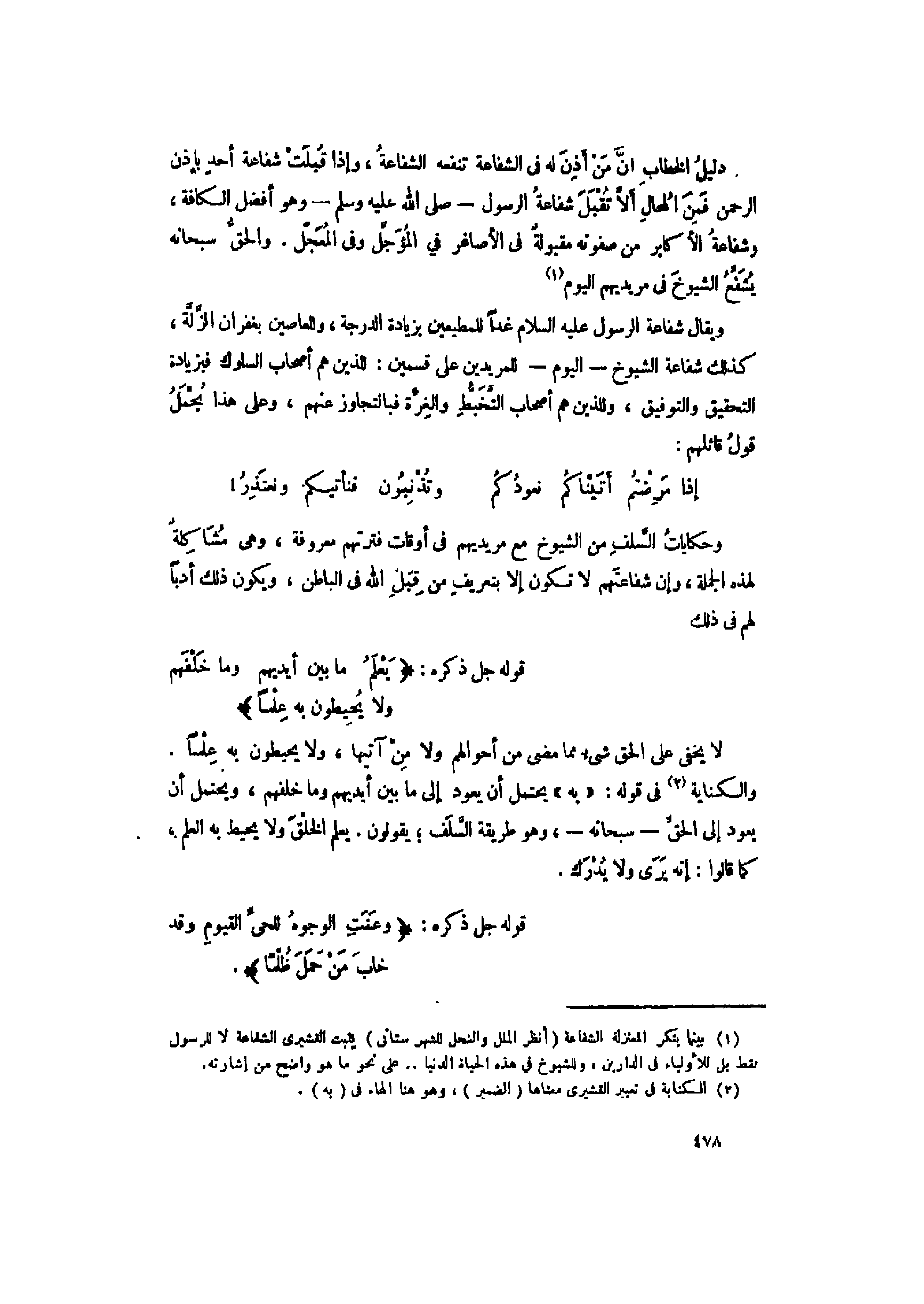 (1) بينما ينكر المعتزلة الشفاعة (أنظر الملل والنحل للشهرستانى) يثبت القشيري الشفاعة لا للرسول فقط بل للأولياء فى الدارين، وللشيوخ في هذه الحياة الدنيا.. على نحو ما هو واضح من إشارته.