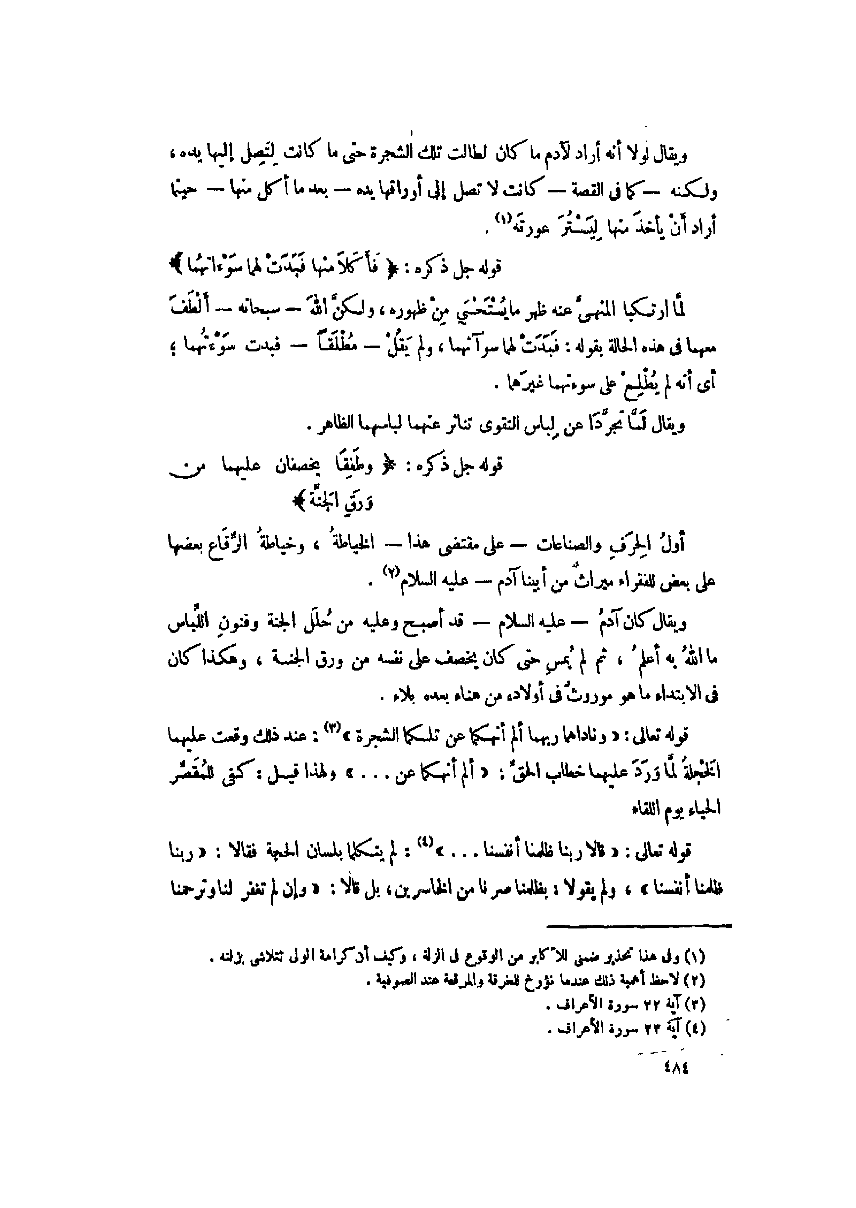 ويقال لولا أنه أراد لآدم ما كان لطالت تلك الشجرة حتى ما كانت لتصل إليها يده، ولكنه- كما فى القصة- كانت لا تصل إلى أوراقها يده- بعد ما أكل منها- حينما أراد أن يأخذ منها ليسترد عورته «1» .