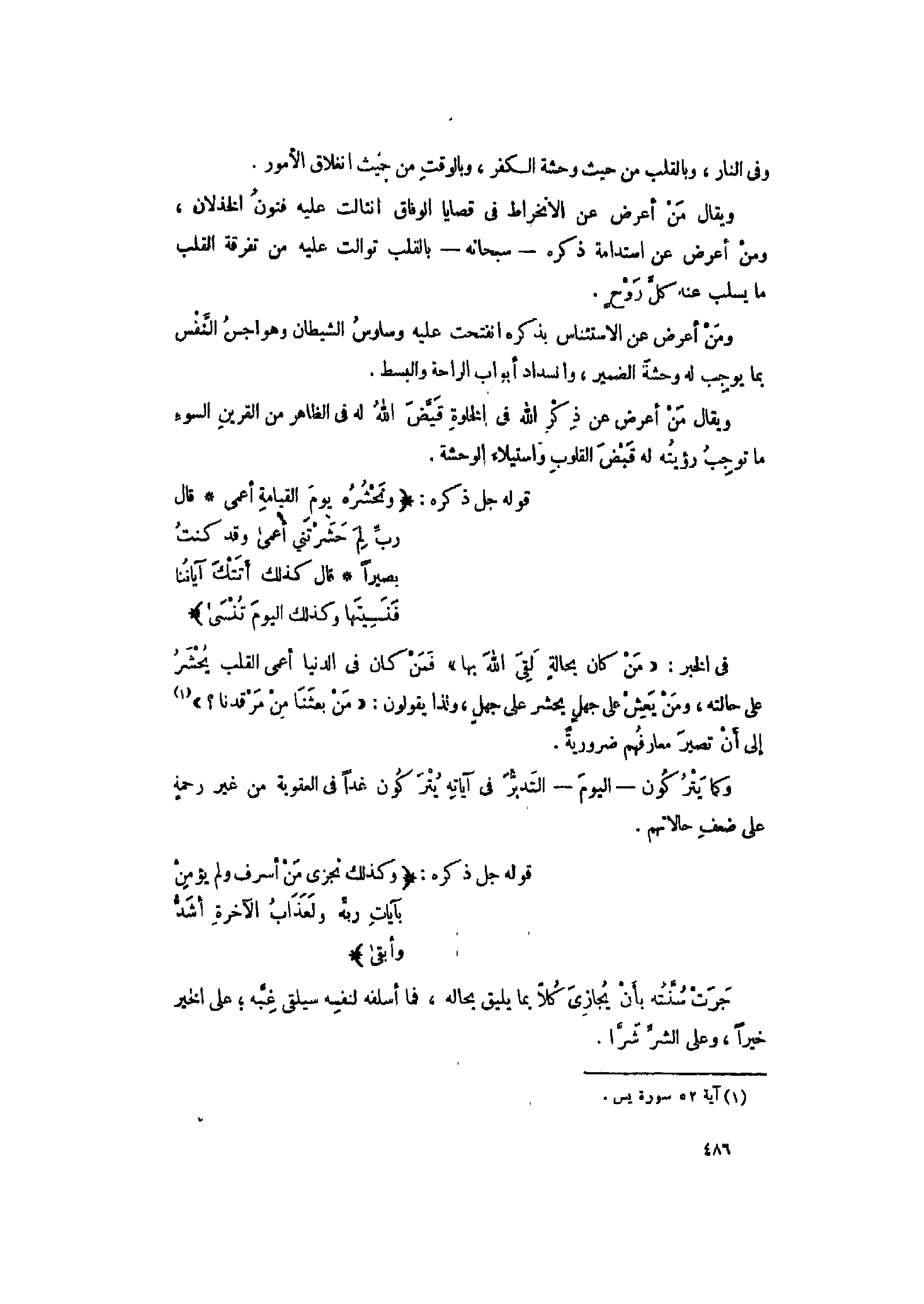 فى الخبر: «من كان بحالة لقى الله بها» فمن كان فى الدنيا أعمى القلب يحشر على حالته، ومن يعش على جهل يحشر على جهل، ولذا يقولون: «مَنْ بَعَثَنا مِنْ مَرْقَدِنا؟» «1» إلى أن تصير معارفهم ضرورية.