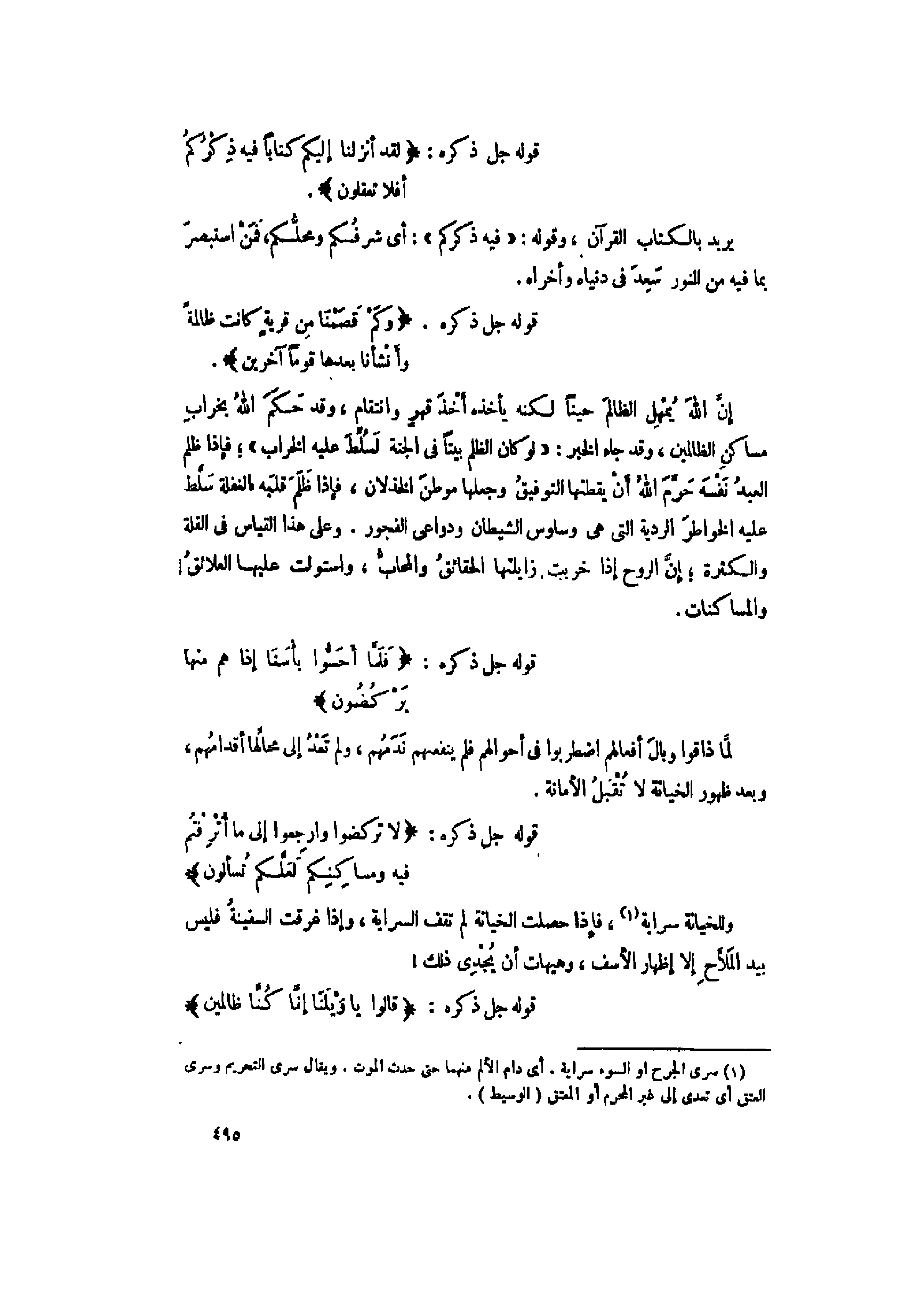 إنّ الله يمهل الظالم حينا لكنه يأخذه أخذ قهر وانتقام، وقد حكم الله بخراب مساكن الظالمين، وقد جاء الخبر: «لو كان الظلم بيتا فى الجنة لسلّط عليه الخراب» فإذا ظلم العبد نفسه حرّم الله أن يقطنها التوفيق وجعلها موطن الخذلان، فإذا ظلم قلبه بالغفلة سلّط عليه الخواطر الردية التي هى وساوس الشيطان ودواعى الفجور. وعلى هذا القياس فى القلة والكثرة إنّ الروح إذا خربت زايلتها الحقائق والمحابّ، واستولت عليها العلائق والمساكنات.