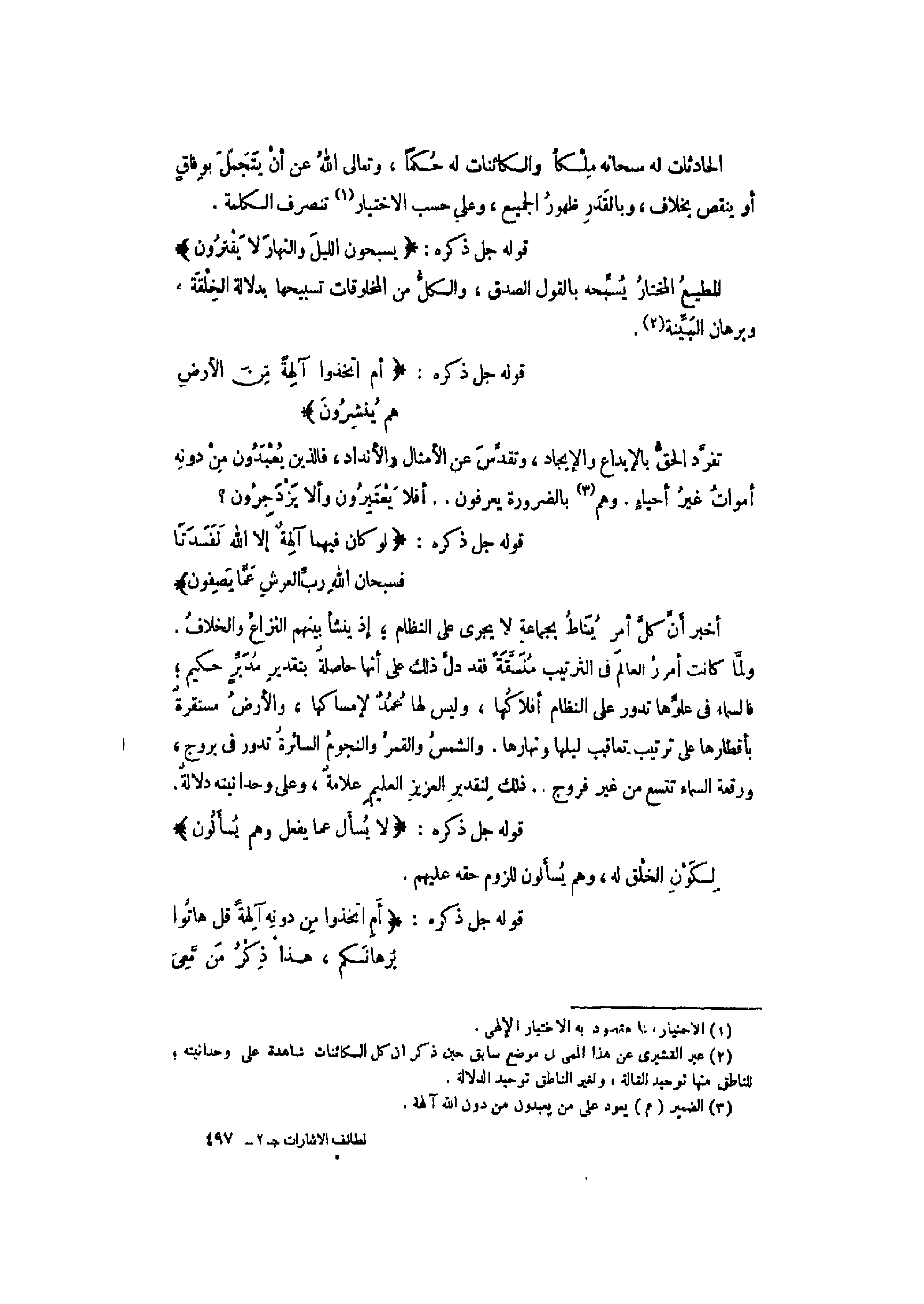 (2) عبر القشيري عن هذا المعنى فى موضع سابق حين ذكر ان كل الكائنات شاهدة على وحدانيته للناطق منها توحيد القالة، ولغير الناطق توحيد الدلالة.