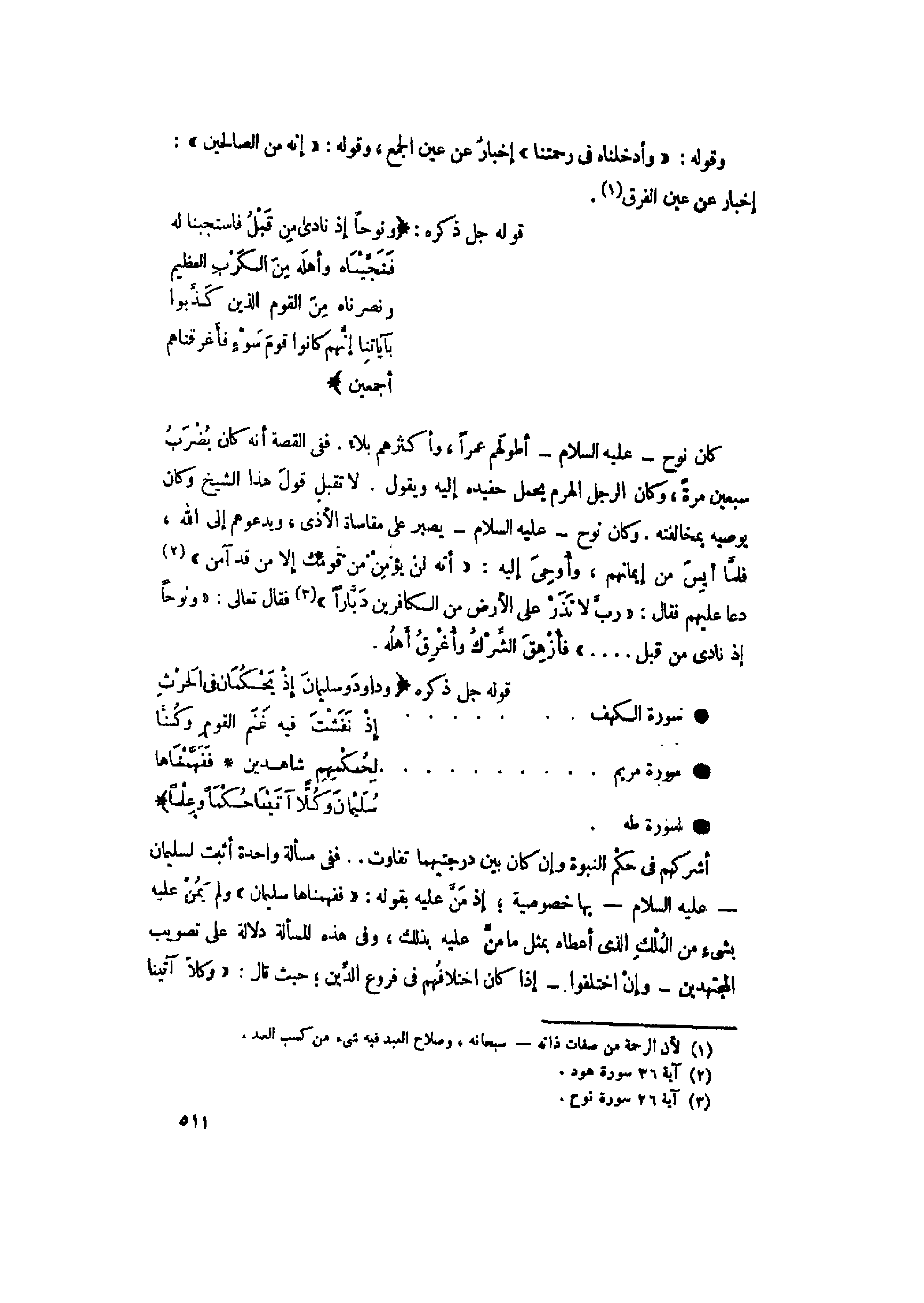 كان نوح- عليه السلام- أطولهم عمرا، وأكثرهم بلاء. ففى القصة أنه كان يضرب سبعين مرة، وكان الرجل الهرم يحمل حفيده إليه ويقول. لا تقبل قول هذا الشيخ وكان يوصيه بمخالفته. وكان نوح- عليه السلام- يصبر على مقاساة الأذى، ويدعوهم إلى الله، فلمّا أيس من إيمانهم، وأوحى إليه: «أَنَّهُ لَنْ يُؤْمِنَ مِنْ قَوْمِكَ إِلَّا مَنْ قَدْ آمَنَ» «2» دعا عليهم فقال: «رَبِّ لا تَذَرْ عَلَى الْأَرْضِ مِنَ الْكافِرِينَ دَيَّاراً» «3» فقال تعالى: «وَنُوحاً إِذْ نادى مِنْ قَبْلُ....» فأزهق الشّرك وأغرق أهله.