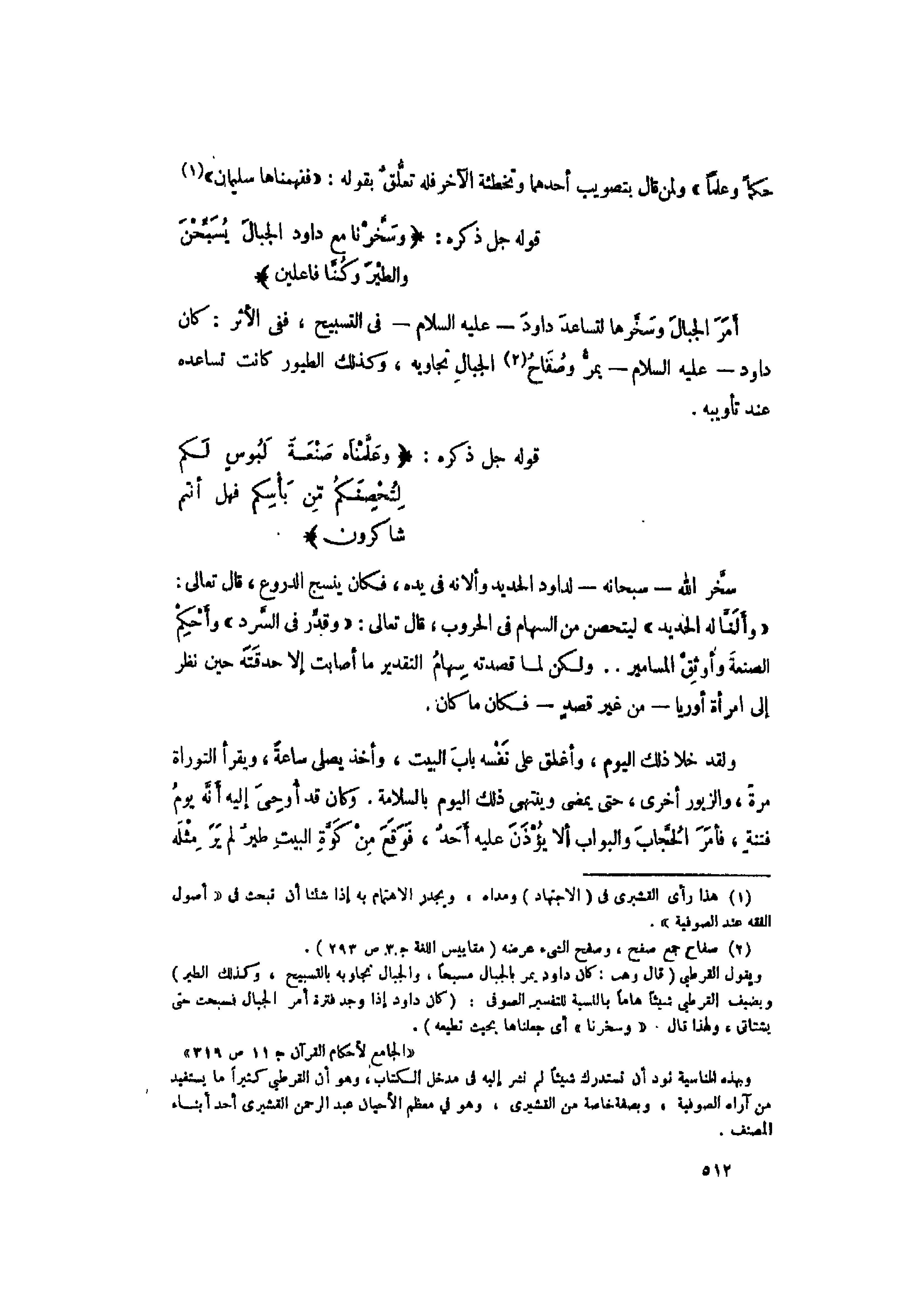 «الجامع لأحكام القرآن ج 11 ص 319» وبهذه المناسبة نود أن نستدرك شيئا لم نشر إليه فى مدخل الكتاب، وهو أن القرطبي كثيرا ما يستفيد من آراء الصوفية، وبصفة خاصة من القشيري، وهو في معظم الأحيان عبد الرحمن القشيري أحد أبناء المصنف.