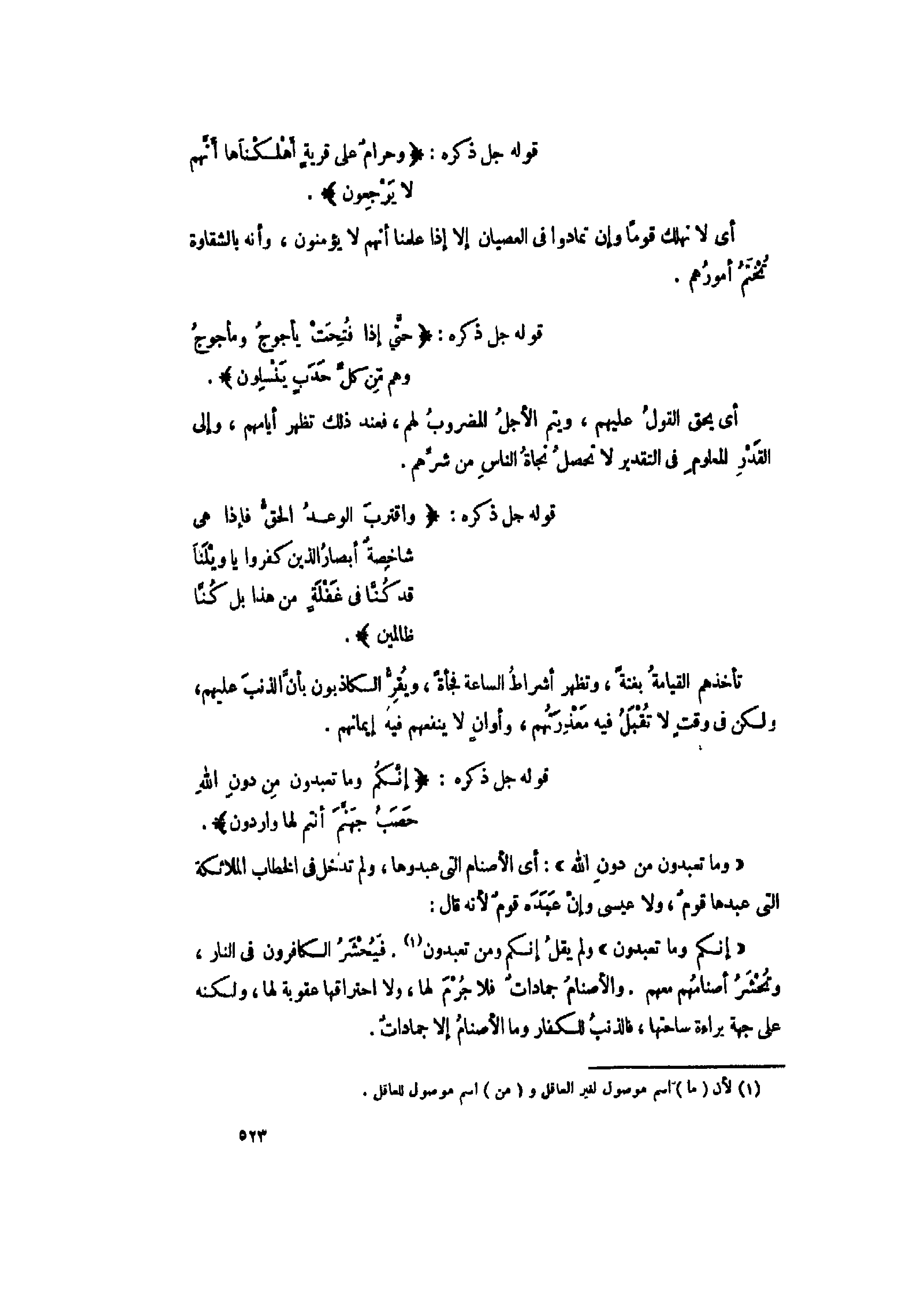 «إِنَّكُمْ وَما تَعْبُدُونَ» ولم يقل إنكم ومن تعبدون «1» . فيحشر الكافرون فى النار، وتحشر أصنامهم معهم. والأصنام جمادات فلا جرم لها، ولا احتراقها عقوبة لها، ولكنه على جهة براءة ساحتها، فالذنب للكفار وما الأصنام إلا جمادات.