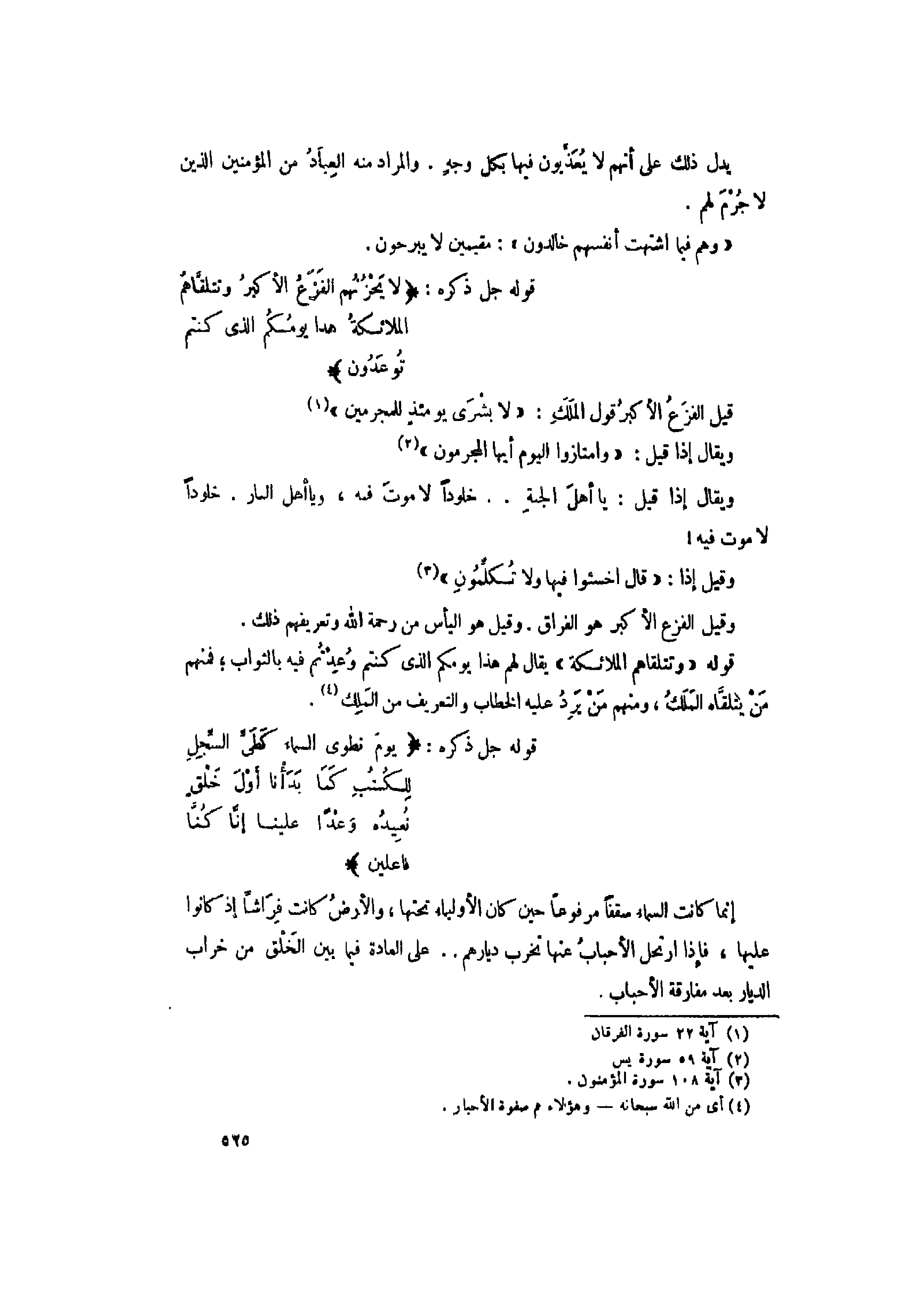 ويقال إذا قيل: يا أهل الجنة.. خلودا لا موت فيه، ويا أهل النار. خلودا لا موت فيه! وقيل إذا: «قالَ اخْسَؤُا فِيها وَلا تُكَلِّمُونِ» «3» وقيل الفزع الأكبر هو الفراق. وقيل هو اليأس من رحمة الله وتعريفهم ذلك.