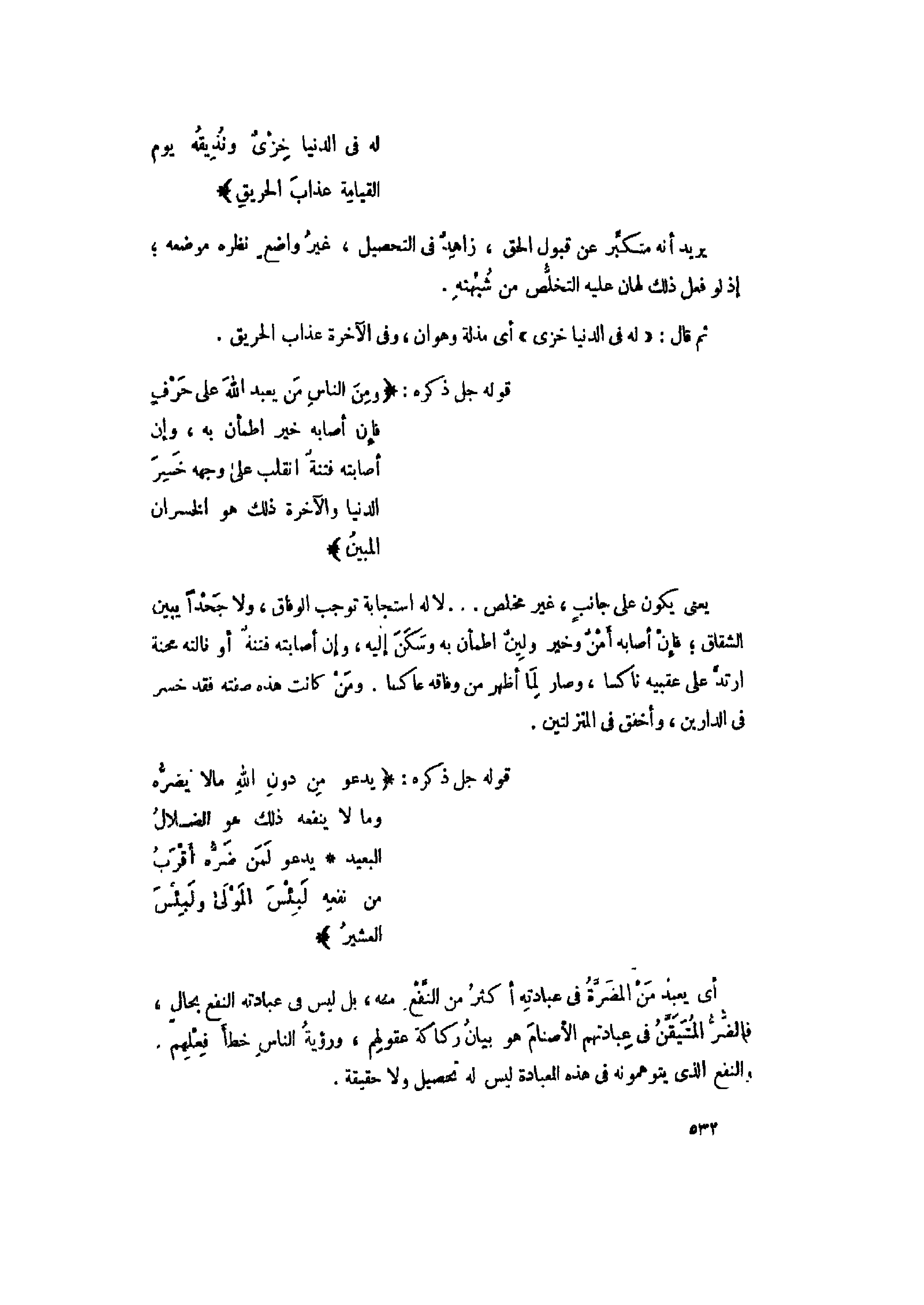 له فى الدنيا خزى ونذيقه يوم القيامة عذاب الحريق يريد أنه متكبّر عن قبول الحق، زاهد فى التحصيل، غير واضع نظره موضعه إذ لو فعل ذلك لهان عليه التخلّص من شبهته.