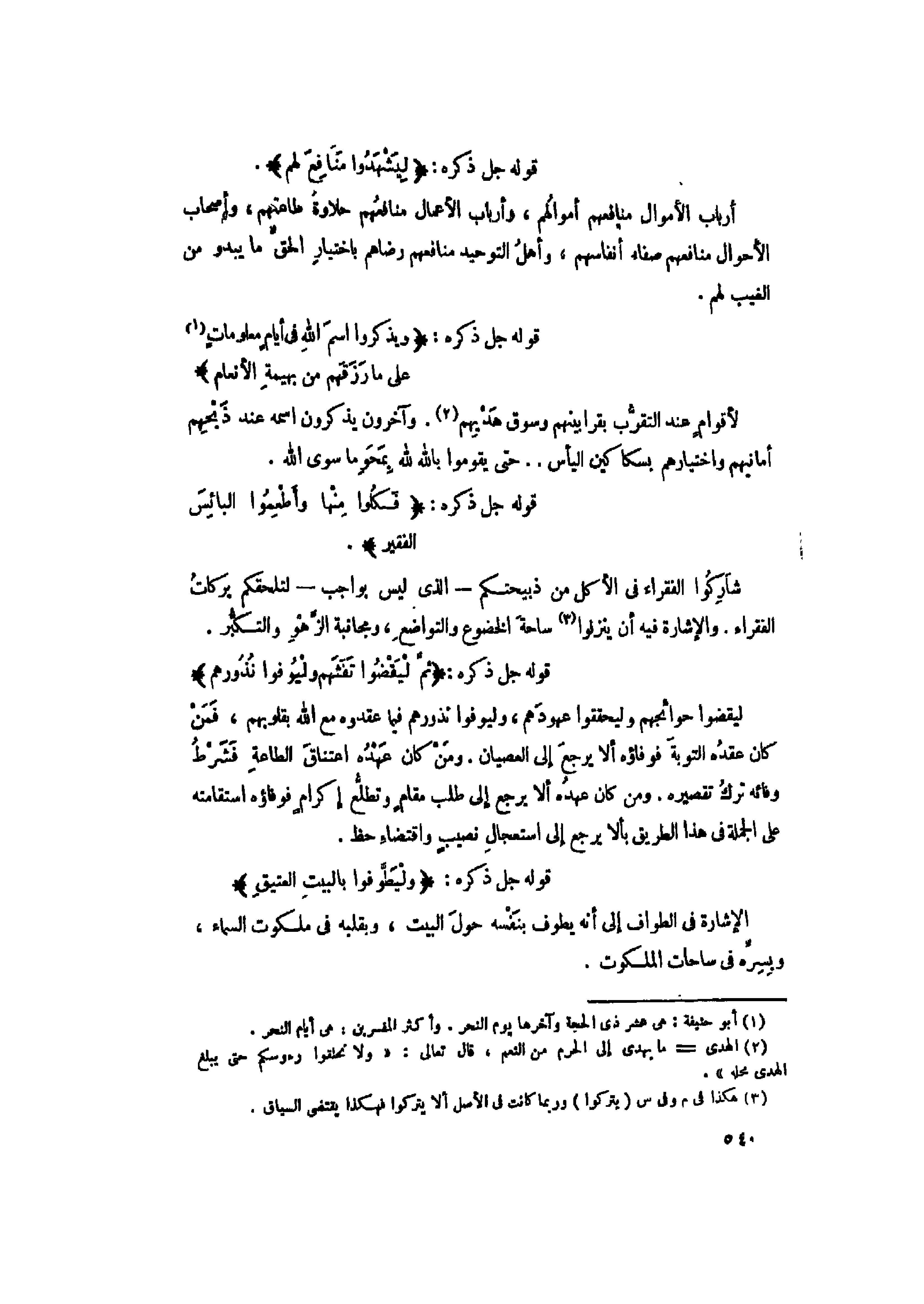 قوله جل ذكره: وَيَذْكُرُوا اسْمَ اللَّهِ فِي أَيَّامٍ مَعْلُوماتٍ «1» عَلى ما رَزَقَهُمْ مِنْ بَهِيمَةِ الْأَنْعامِ لأقوام عند التقرّب بقرابينهم وسوق هديهم «2» . وآخرون يذكرون اسمه عند ذبحهم أمانيهم واختيارهم بسكاكين اليأس.. حتى يقوموا بالله لله بمحو ما سوى الله.