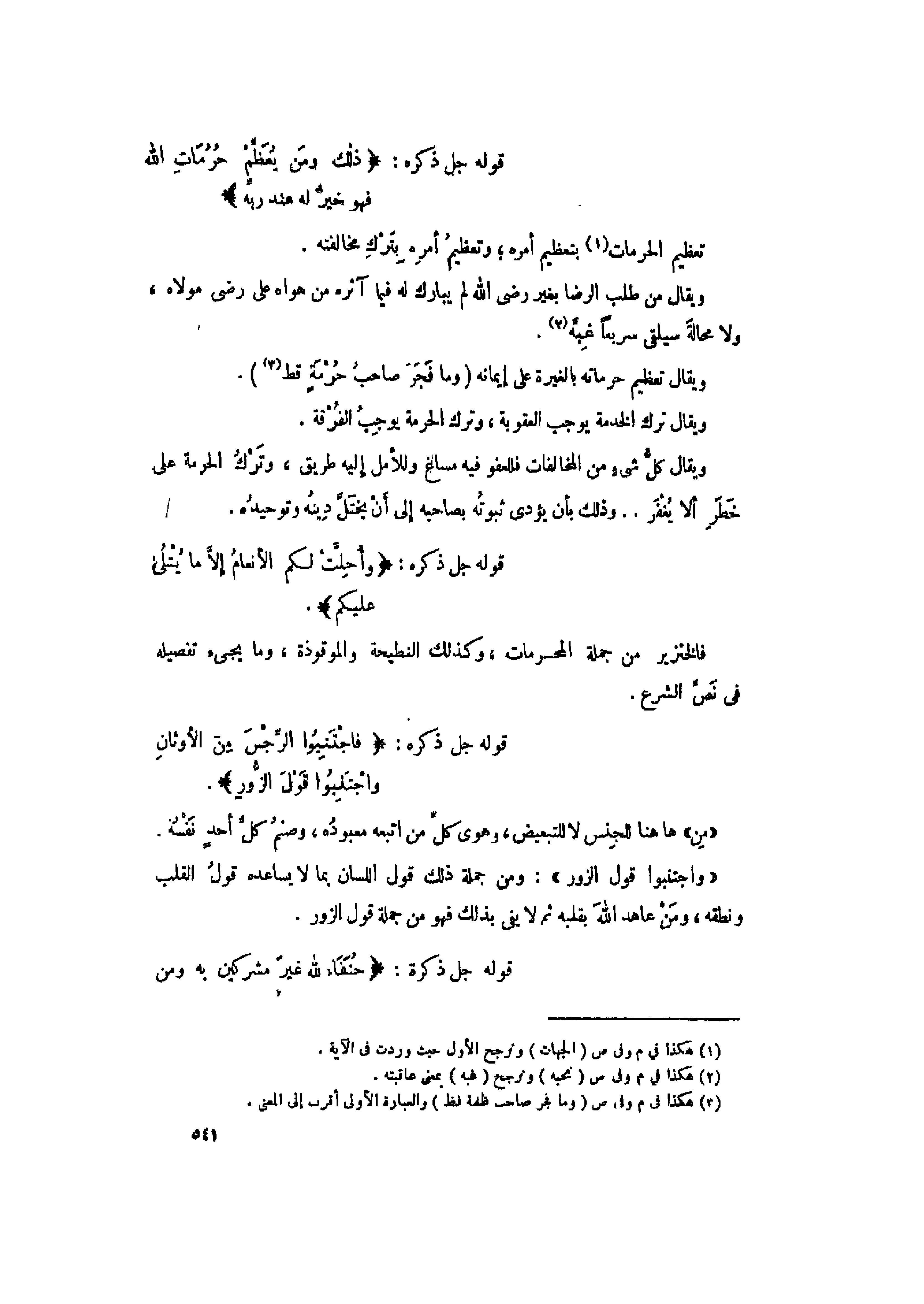 ذلِكَ وَمَنْ يُعَظِّمْ حُرُماتِ اللَّهِ فَهُوَ خَيْرٌ لَهُ عِنْدَ رَبِّهِ وَأُحِلَّتْ لَكُمُ الْأَنْعامُ إِلاَّ ما يُتْلى عَلَيْكُمْ فَاجْتَنِبُوا الرِّجْسَ مِنَ الْأَوْثانِ وَاجْتَنِبُوا قَوْلَ الزُّورِ (30)