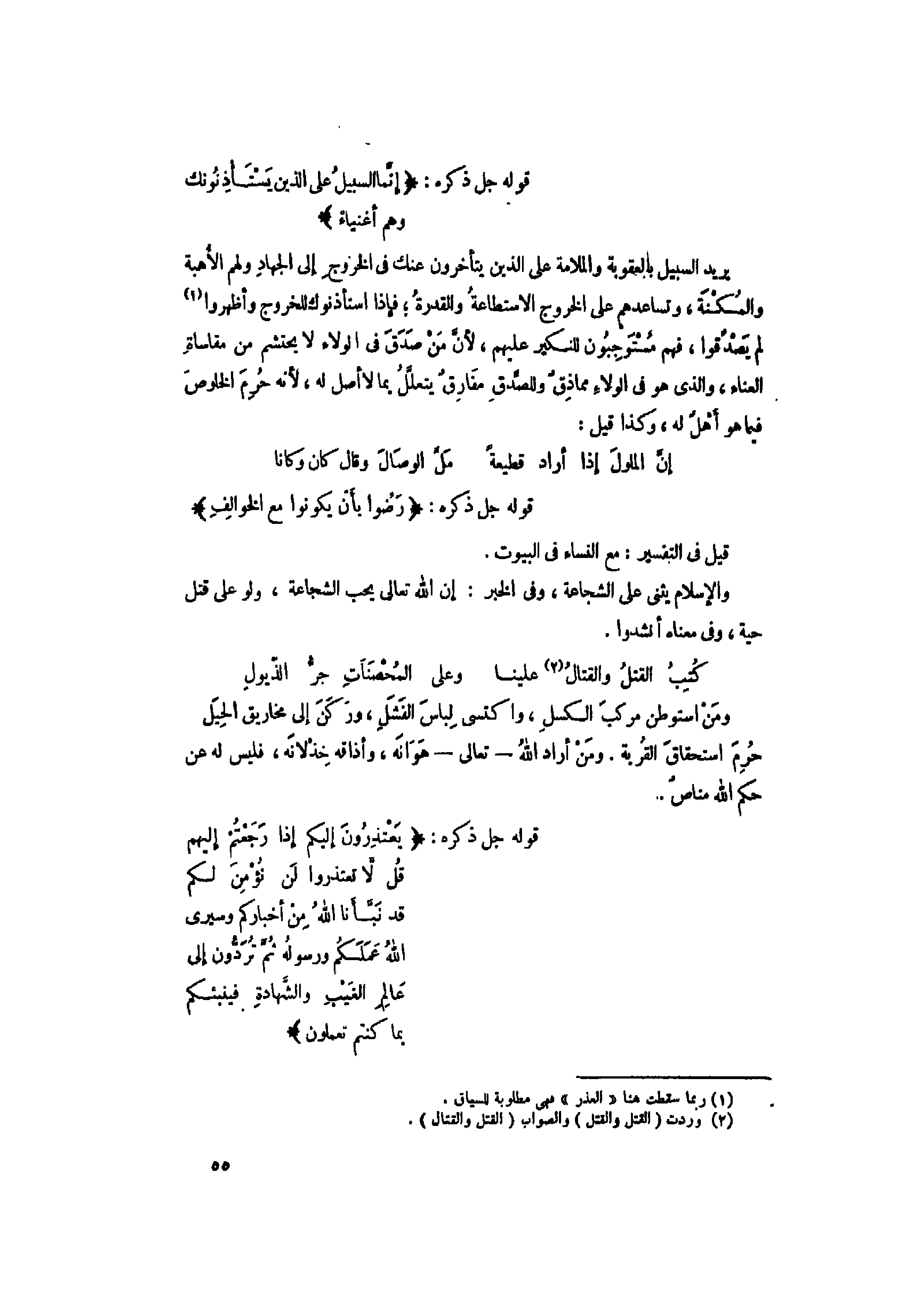 يريد السبيل بالعقوبة والملامة على الذين يتأخرون عنك فى الخروج إلى الجهاد ولهم الأهبة والمكنة، وتساعدهم على الخروج الاستطاعة والقدرة فإذا استأذنوك للخروج وأظهروا «1» لم يصدقوا، فهم مستوجبون للنكير عليهم، لأنّ من صدق فى الولاء لا يحتشم من مقاساة العناء، والذي هو فى الولاء مماذق وللصدّق مفارق يتعلّل بما لا أصل له، لأنه حرم الخلوص فيما هو أهل له، وكذا قيل: