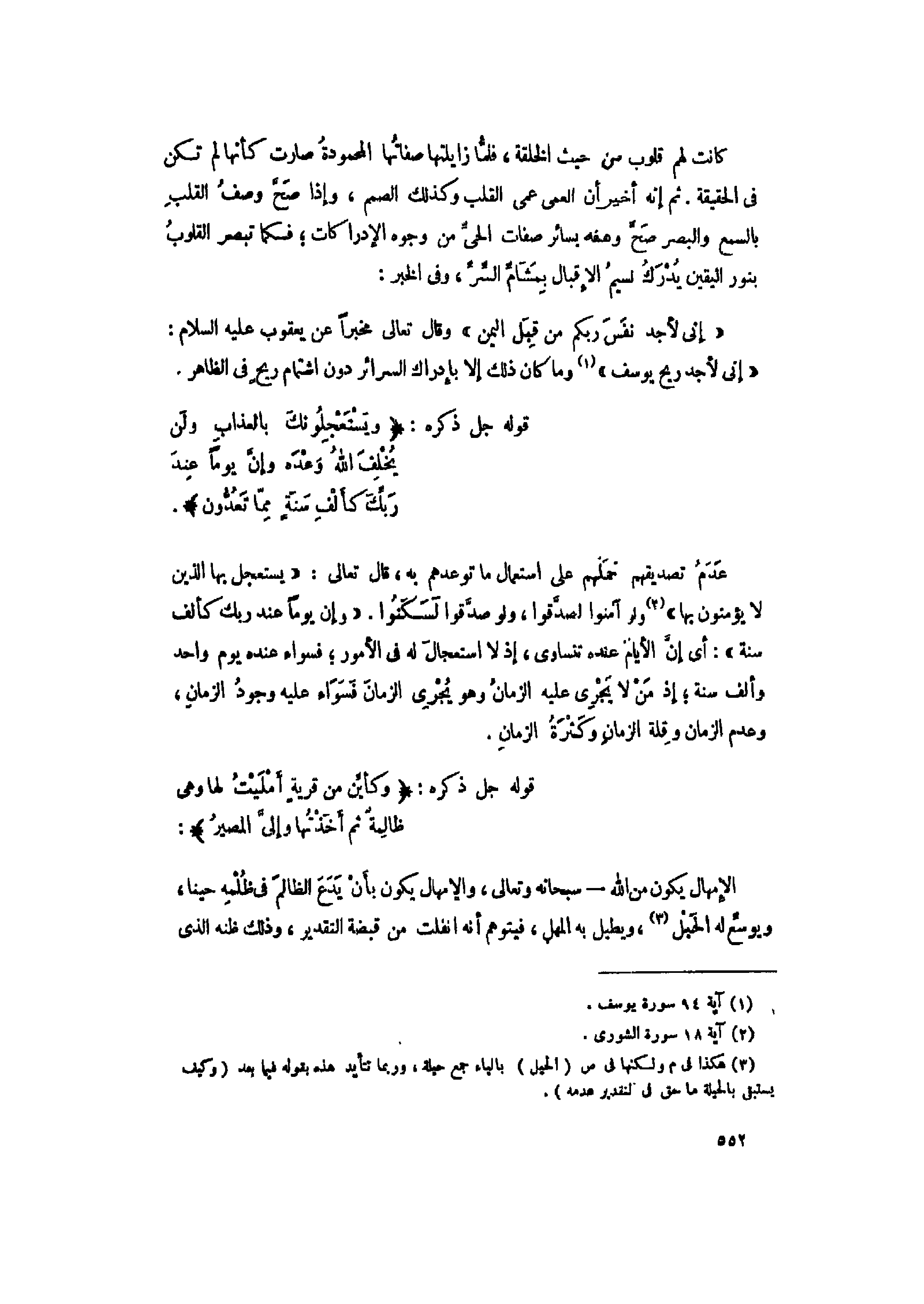 عدم تصديقهم حملهم على استعمال ما توعدهم به، قال تعالى: «يَسْتَعْجِلُ بِهَا الَّذِينَ لا يُؤْمِنُونَ بِها» «2» ولو آمنوا لصدّقوا، ولو صدّقوا لسكنوا. «وَإِنَّ يَوْماً عِنْدَ رَبِّكَ كَأَلْفِ سَنَةٍ»