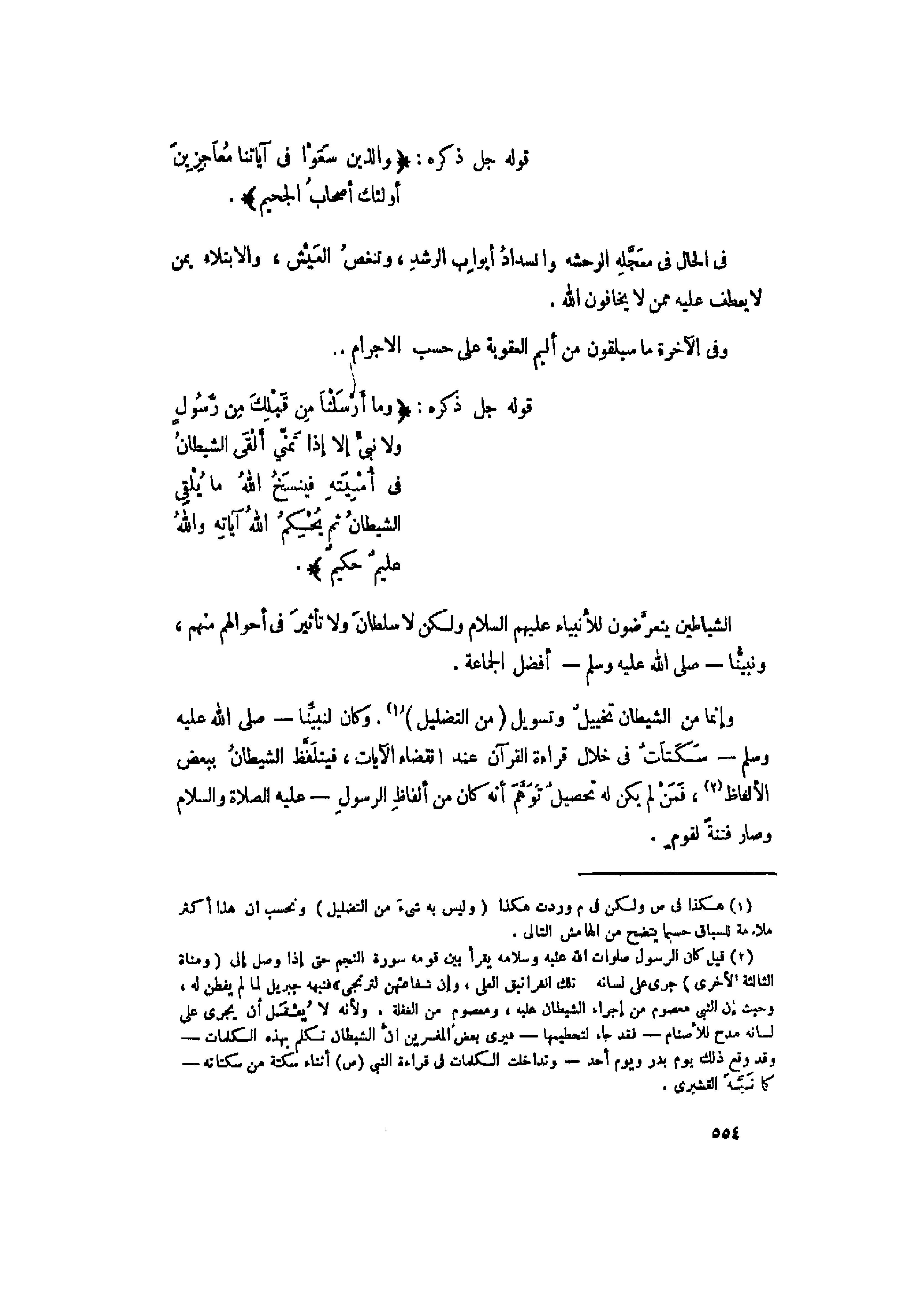 (2) قيل كان الرسول صلوات الله عليه وسلامه يقرأ بين قومه سورة النجم حتى إذا وصل إلى (ومناة الثالثة الأخرى) جرى على لسانه. تلك الفرانيق العلى، وإن شفاعتهن لترتجى» فنبهه جبريل لما لم يفطن له، وحيث إن النبي معصوم من إجراء الشيطان عليه، ومعصوم من الغفلة، ولأنه لا يعقل أن يجرى على لسانه مدح للأصنام- فقد جاء لتحطيمها- فيرى بعض المفسرين انّ الشيطان تكلم بهذه الكلمات- وقد وقع ذلك يوم بدر ويوم أحد- وتداخلت الكلمات فى قراءة النبي (ص) أثناء سكتة من سكتاته- كما نبّه القشيري.