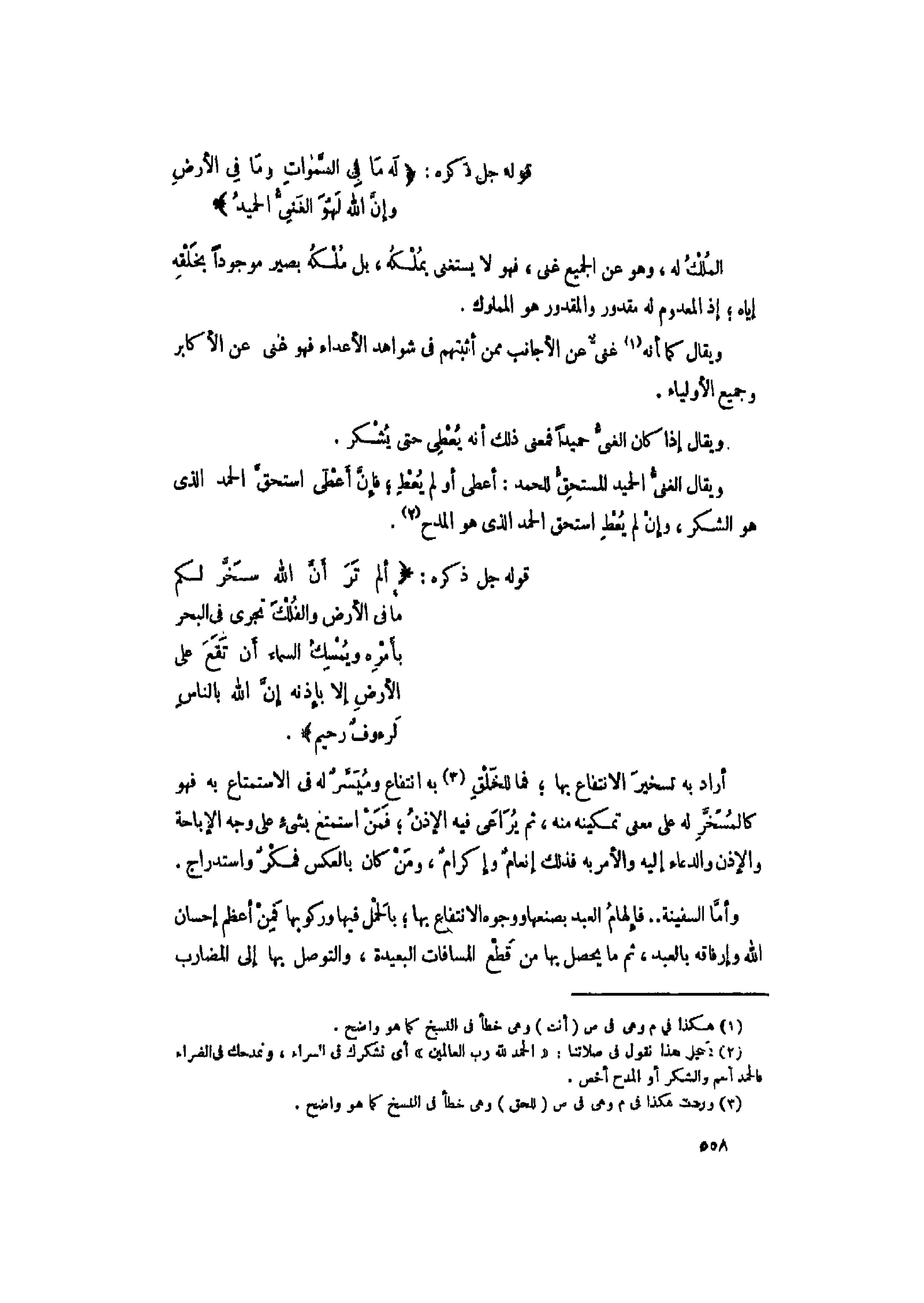 الملك له، وهو عن الجميع غنى، فهو لا يستغنى بملكه، بل ملكه بصير موجودا بخلقه إياه إذ المعدوم له مقدور والمقدور هو المملوك.